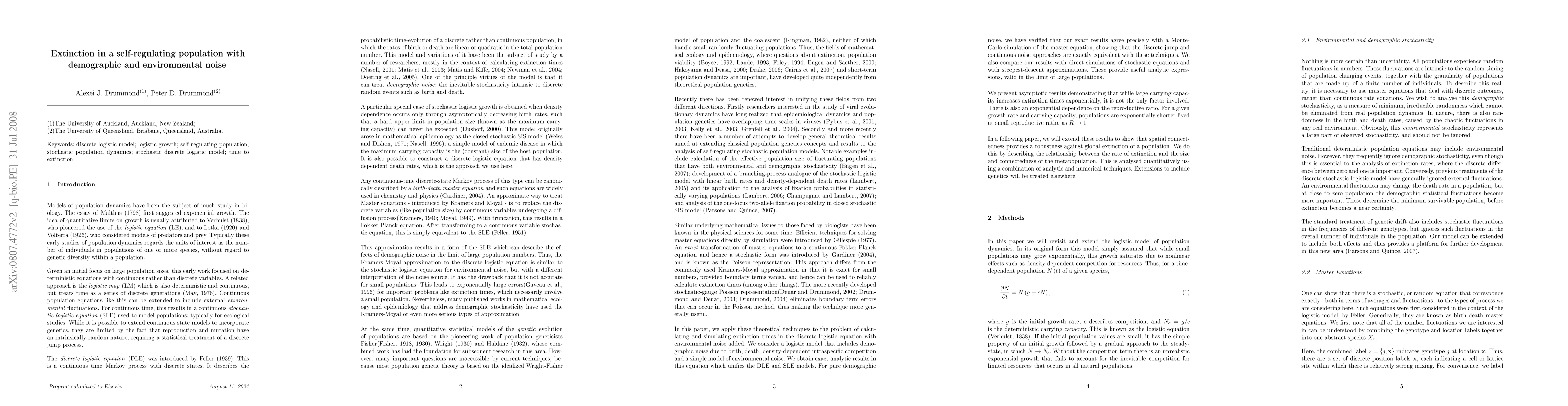 This paper develops a stochastic model to analyze population fluctuations and extinction in self-regulating populations, considering both demographic and environmental noise. It provides analytical and simulation-based results on extinction times, comparing the effects of different stochastic factors and demonstrating the equivalence of various modeling approaches.