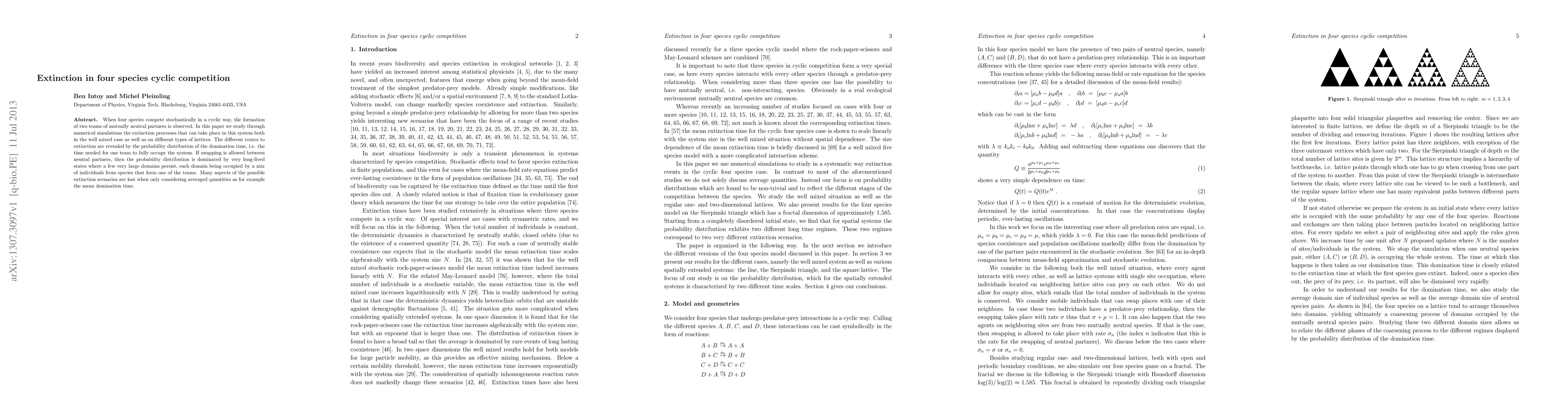 This paper investigates extinction processes in a cyclic competition among four species through numerical simulations, examining both well-mixed and lattice systems. It reveals diverse extinction routes via the probability distribution of domination time, highlighting that allowing swapping between neutral partners leads to long-lived states with large, mixed-species domains.