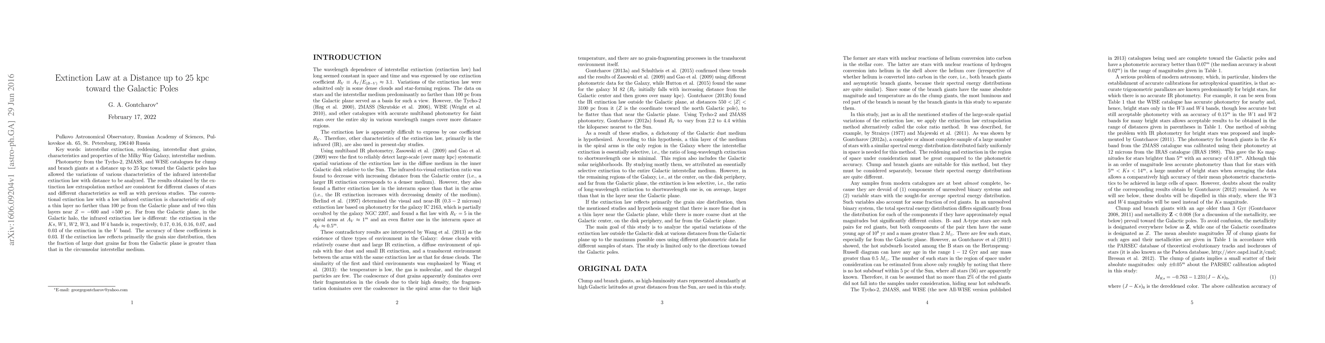 This study analyzes the interstellar extinction law up to 25 kpc toward the Galactic poles using data from Tycho-2, 2MASS, and WISE catalogues. It finds that the conventional extinction law applies only close to the Galactic plane, while in the Galactic halo, the infrared extinction is significantly lower, indicating a higher fraction of large dust grains.