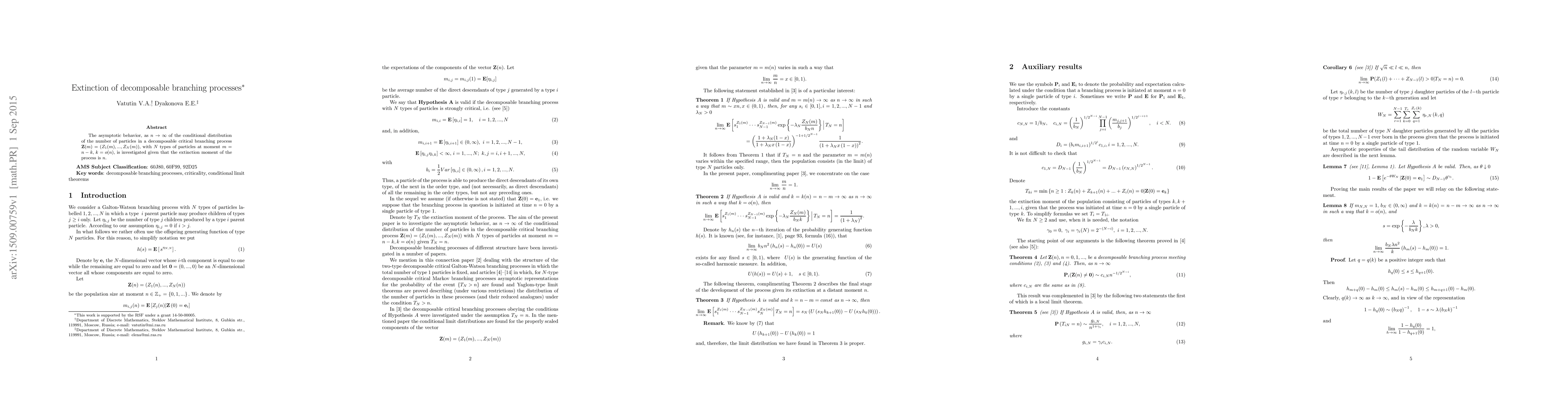 This paper investigates the asymptotic behavior of decomposable critical branching processes as they approach extinction. It finds that the number of particles in the process follows a predictable pattern before extinction occurs at moment n.