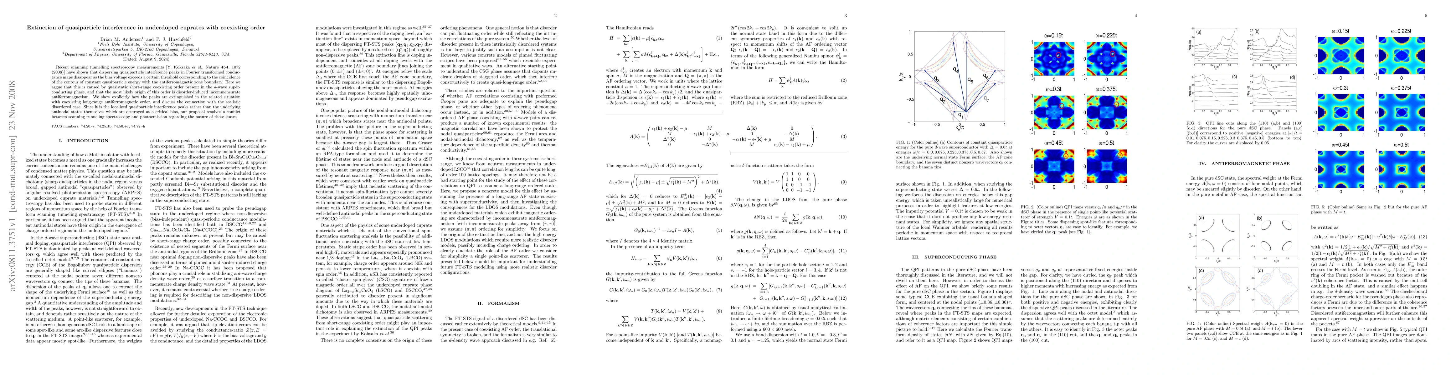 Recent scanning tunnelling spectroscopy measurements [Y. Koksaka et al., Nature 454, 1072 (2008)] have shown that dispersing quasiparticle interference peaks in Fourier transformed conductance maps disappear as the bias voltage exceeds a certain threshold corresponding to the coincidence of the contour of constant quasiparticle energy with the antiferromagnetic zone boundary. Here we argue that this is caused by quasistatic short-range coexisting order present in the d-wave superconducting phase, and that the most likely origin of this order is disorder-induced incommensurate antiferromagnetism. We show explicitly how the peaks are extinguished in the related situation with coexisting long-range antiferromagnetic order, and discuss the connection with the realistic disordered case. Since it is the localized quasiparticle interference peaks rather than the underlying antinodal states themselves which are destroyed at a critical bias, our proposal resolves a conflict between scanning tunneling spectroscopy and photoemission regarding the nature of these states.