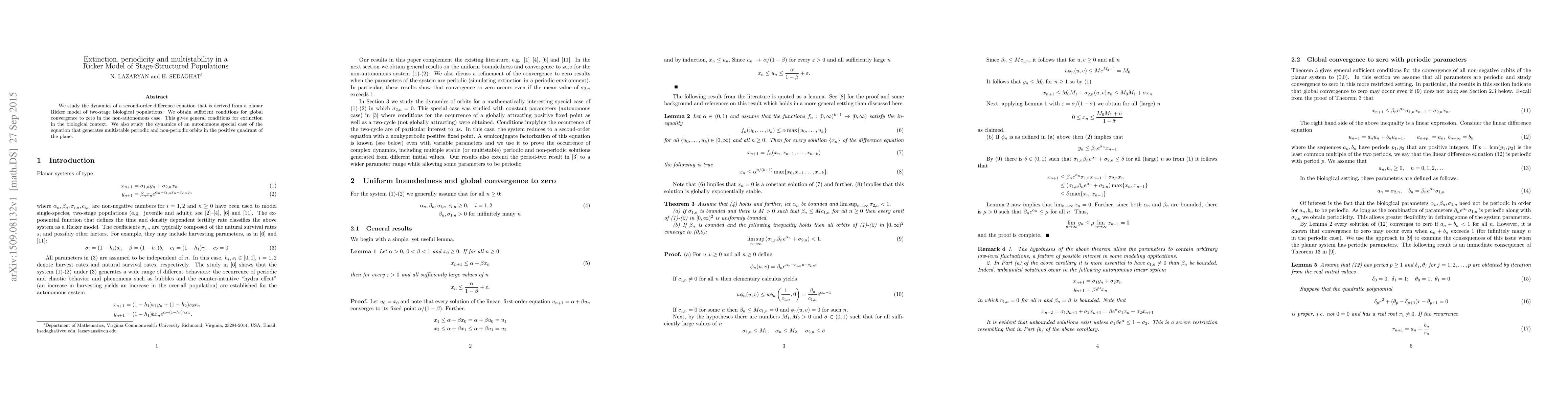 We study the dynamics of a second-order difference equation that is derived from a planar Ricker model of two-stage (e.g. adult, juvenile) biological populations. We obtain sufficient conditions for global convergence to zero in the non-autonomous case. This gives general conditions for extinction in the biological context. We also study the dynamics of an autonomous special case of the equation that generates multistable periodic and non-periodic orbits in the positive quadrant of the plane.