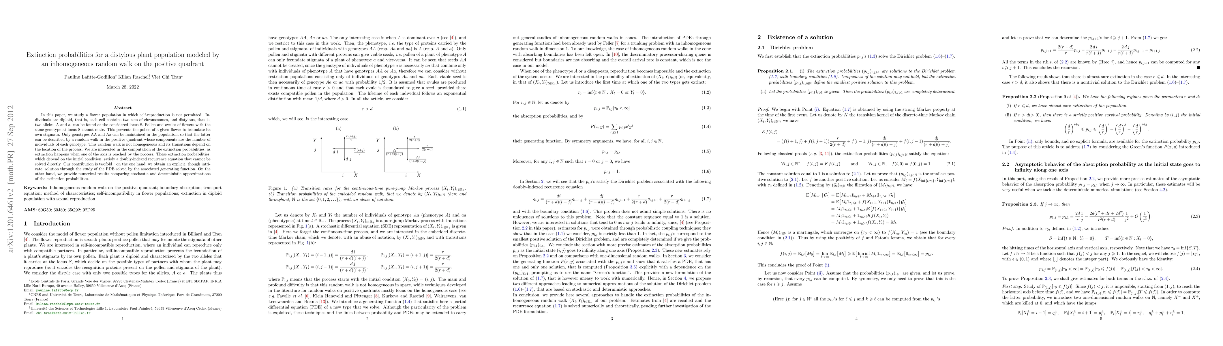 In this paper, we study a flower population in which self-reproduction is not permitted. Individuals are diploid, {that is, each cell contains two sets of chromosomes}, and {distylous, that is, two alleles, A and a, can be found at the considered locus S}. Pollen and ovules of flowers with the same genotype at locus S cannot mate. This prevents the pollen of a given flower to fecundate its {own} stigmata. Only genotypes AA and Aa can be maintained in the population, so that the latter can be described by a random walk in the positive quadrant whose components are the number of individuals of each genotype. This random walk is not homogeneous and its transitions depend on the location of the process. We are interested in the computation of the extinction probabilities, {as} extinction happens when one of the axis is reached by the process. These extinction probabilities, which depend on the initial condition, satisfy a doubly-indexed recurrence equation that cannot be solved directly. {Our contribution is twofold : on the one hand, we obtain an explicit, though intricate, solution through the study of the PDE solved by the associated generating function. On the other hand, we provide numerical results comparing stochastic and deterministic approximations of the extinction probabilities.