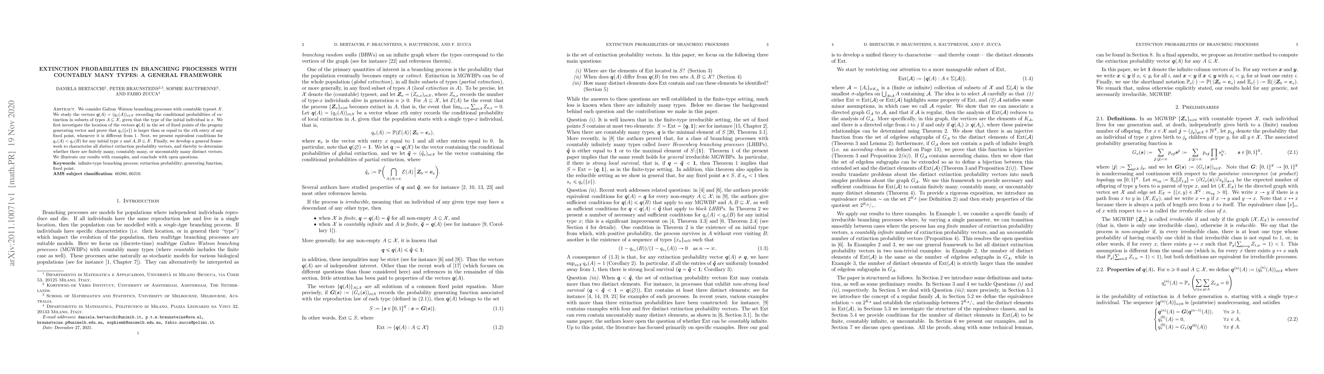 This paper studies Galton-Watson branching processes with countable types, focusing on extinction probabilities in subsets of types. It develops a general framework to characterize distinct extinction probability vectors and determines the number of such vectors, proving conditions for their comparison and illustrating with examples.