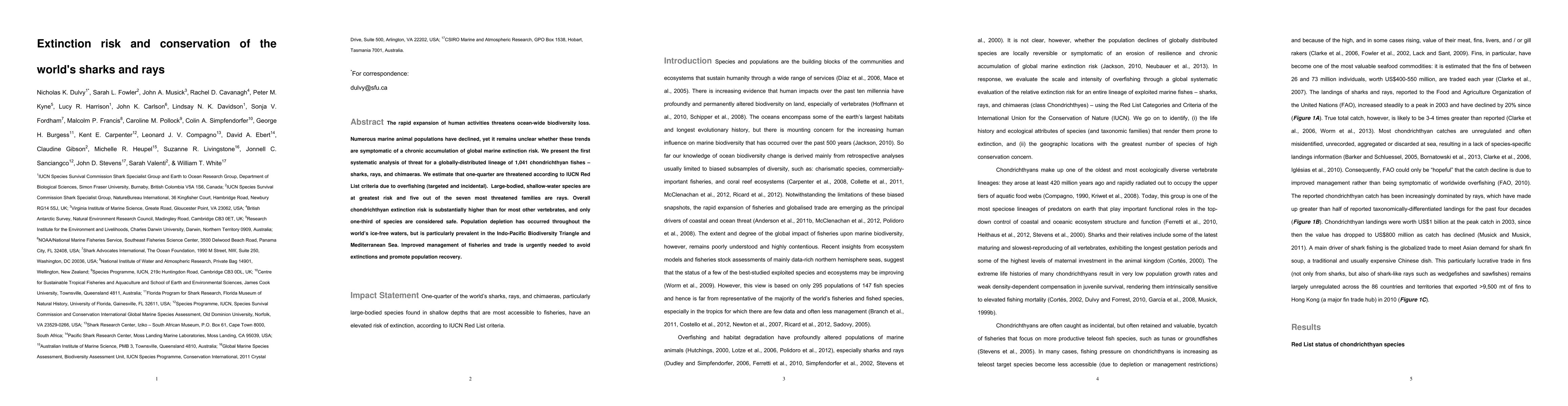 This paper systematically analyzes the extinction risk for 1,041 species of sharks, rays, and chimaeras, finding that one-quarter are threatened primarily due to overfishing. Urgent improved management of fisheries and trade is needed to prevent extinctions and promote recovery.