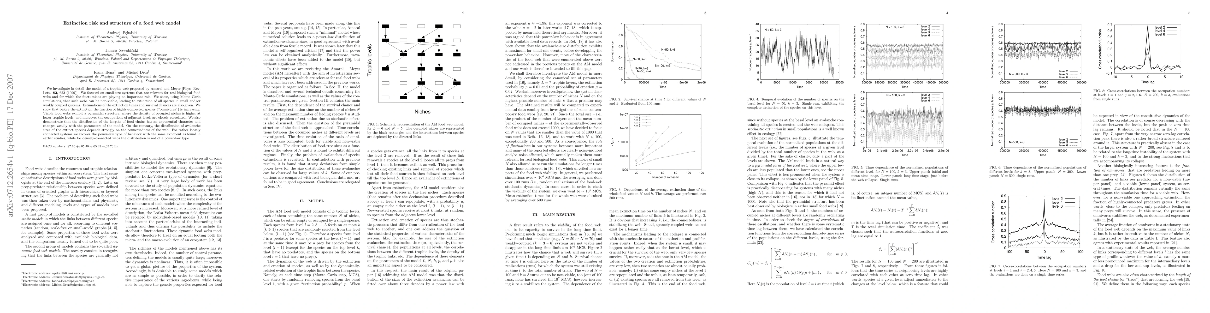 The paper presents detailed Monte Carlo simulations of a food web model, uncovering new aspects of food web viability, structure, and extinction dynamics, particularly in small systems where fluctuations are significant.