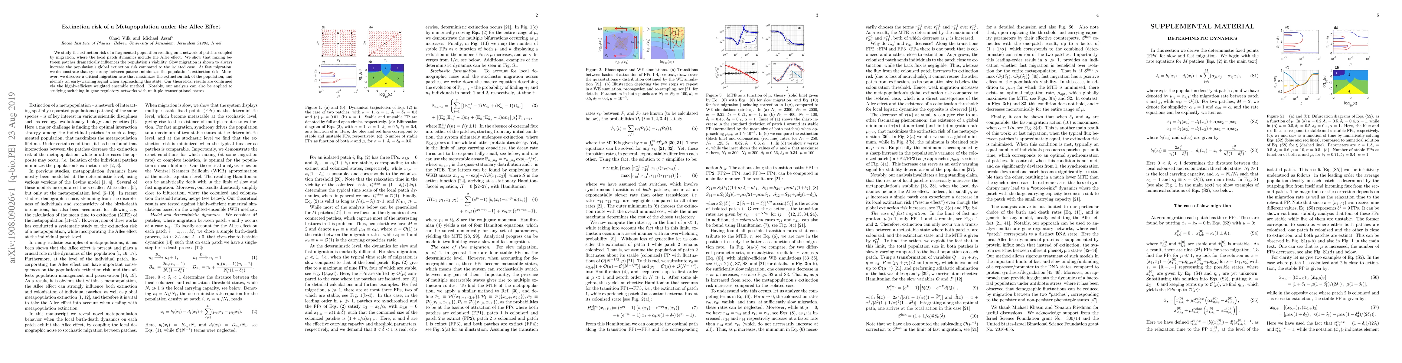 The paper presents a detailed theoretical framework for analyzing the extinction risk of metapopulations under the Allee effect, incorporating migration dynamics and confirming results through WE simulations.