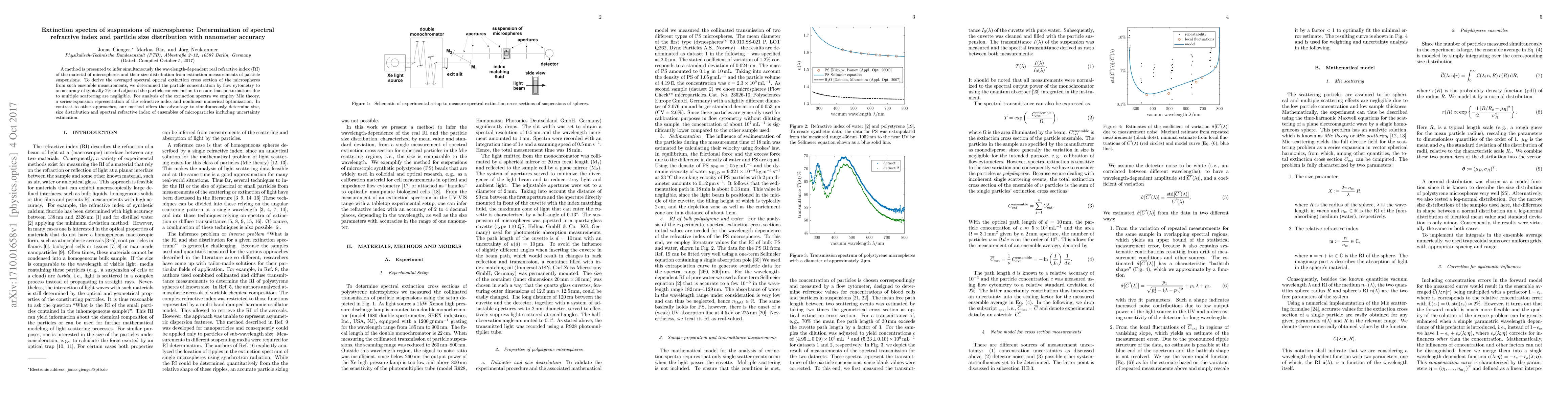 This paper presents a method for determining the spectral refractive index and size distribution of microspheres using extinction measurements and Mie theory, achieving nanometer accuracy. The approach employs flow cytometry to control particle concentration and nonlinear optimization to analyze the extinction spectra, providing simultaneous and precise determination of these parameters.