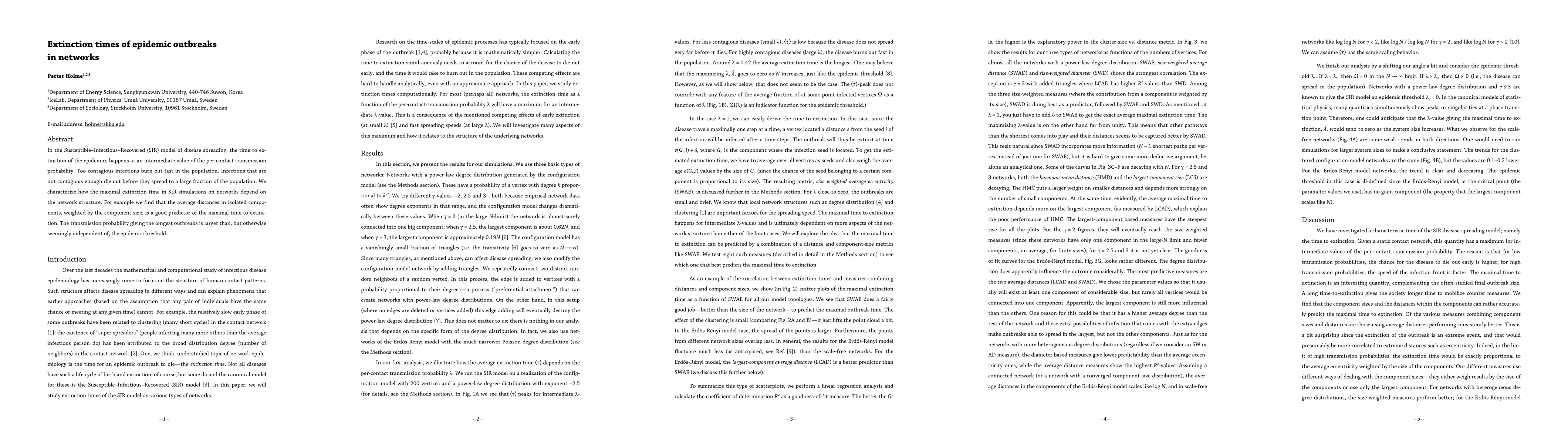 This paper investigates the extinction times of epidemics in the SIR model across various network structures, finding that maximal extinction times occur at intermediate transmission probabilities. It reveals that the average distances in isolated network components, weighted by component size, effectively predict the longest outbreak durations.