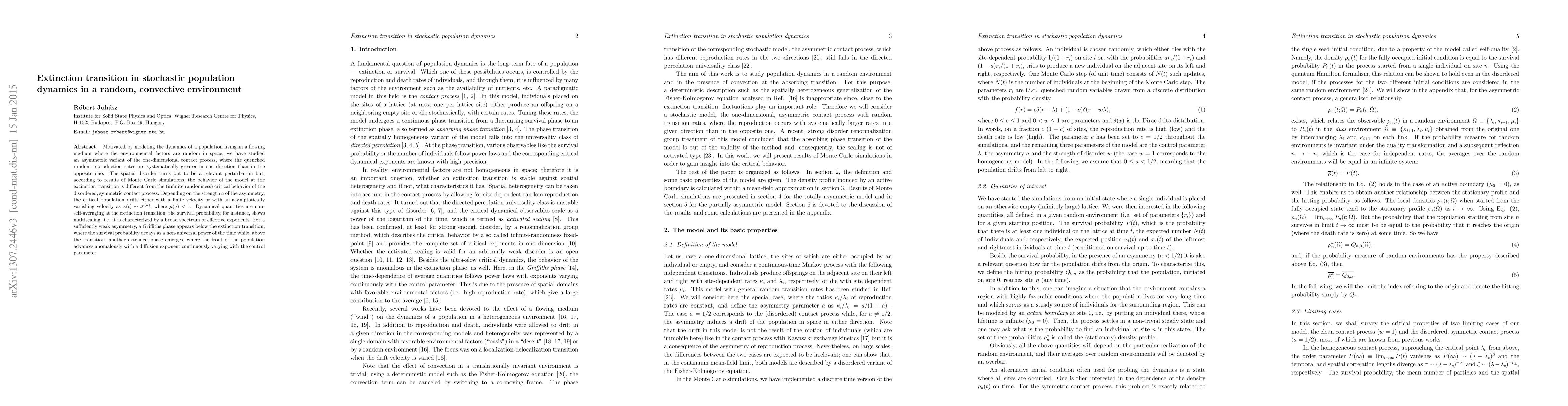 This paper investigates an asymmetric one-dimensional contact process in a random, convective environment, finding that spatial disorder affects the extinction transition differently from symmetric processes. The study reveals multiscaling in survival probability and the emergence of a Griffiths phase and an extended phase with anomalous diffusion, depending on the asymmetry strength.