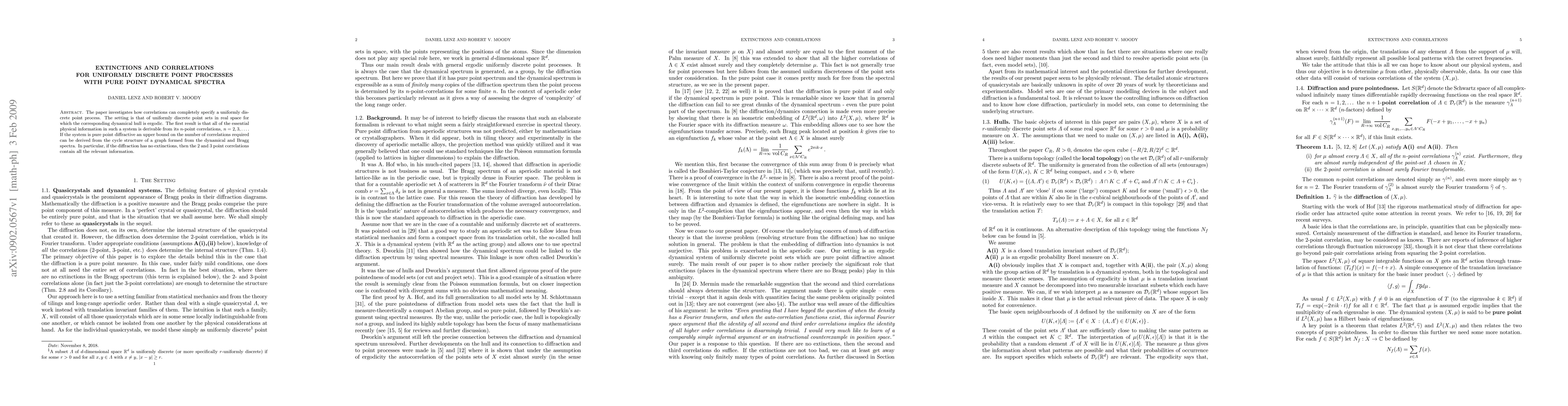 The paper investigates how correlations can completely specify a uniformly discrete point process. The setting is that of uniformly discrete point sets in real space for which the corresponding dynamical hull is ergodic. The first result is that all of the essential physical information in such a system is derivable from its $n$-point correlations, $n= 2, 3, >...$. If the system is pure point diffractive an upper bound on the number of correlations required can be derived from the cycle structure of a graph formed from the dynamical and Bragg spectra. In particular, if the diffraction has no extinctions, then the 2 and 3 point correlations contain all the relevant information.