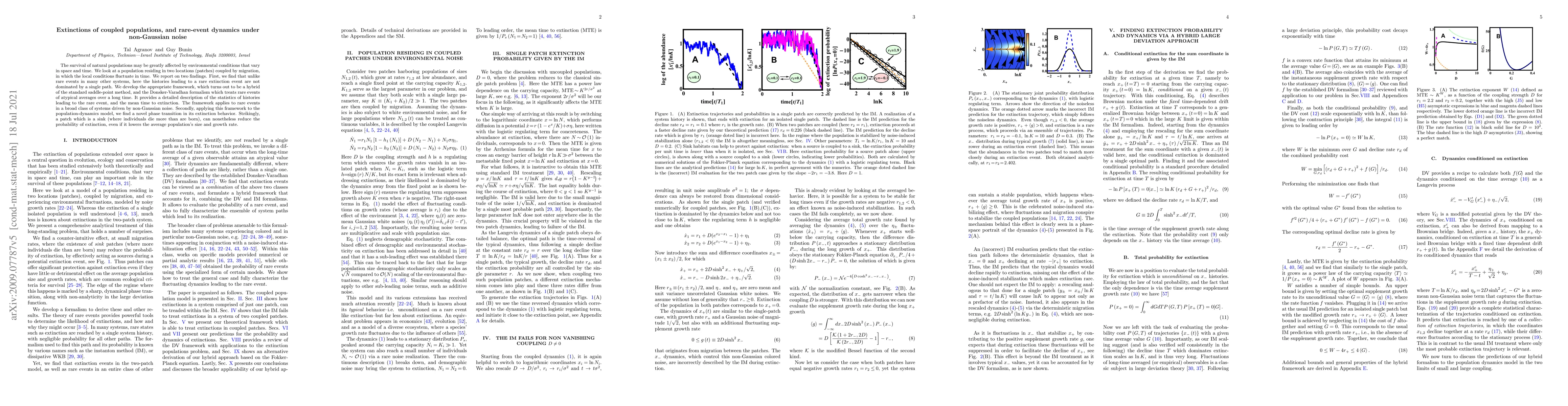 The survival of natural populations may be greatly affected by environmental conditions that vary in space and time. We look at a population residing in two locations (patches) coupled by migration, in which the local conditions fluctuate in time. We report on two findings. First, we find that unlike rare events in many other systems, here the histories leading to a rare extinction event are not dominated by a single path. We develop the appropriate framework, which turns out to be a hybrid of the standard saddle-point method, and the Donsker-Varadhan formalism which treats rare events of atypical averages over a long time. It provides a detailed description of the statistics of histories leading to the rare event. The framework applies to rare events in a broad class of systems driven by non-Gaussian noise. Secondly, applying this framework to the population-dynamics model, we find a novel phase transition in its extinction behavior. Strikingly, a patch which is a sink (where individuals die more than are born), can nonetheless reduce the probability of extinction, even if it normally lowers the population's size and growth rate.