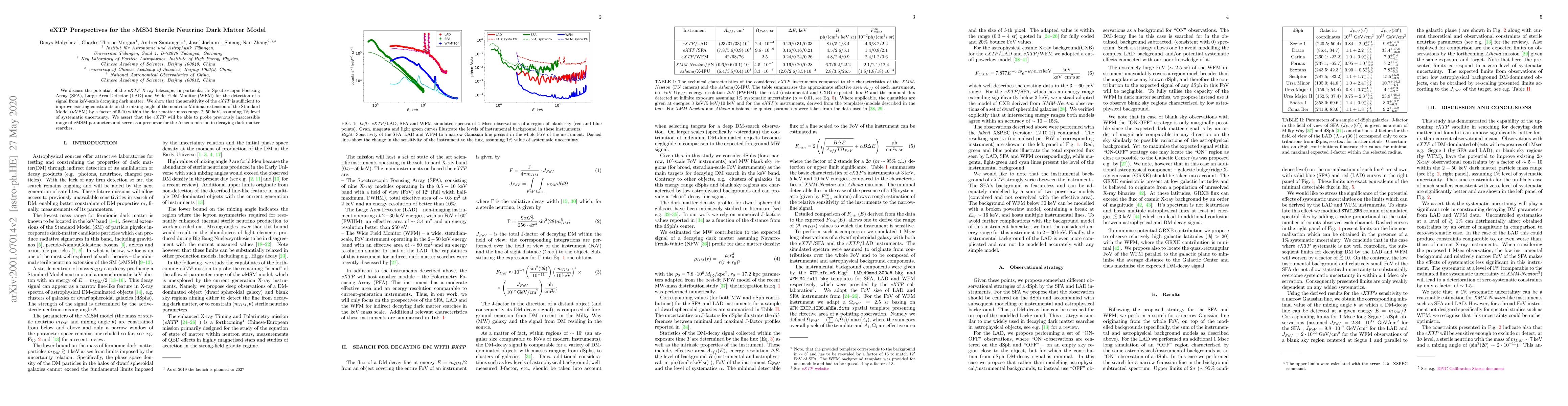 The eXTP X-ray telescope is projected to significantly enhance constraints on the $\nu$MSM sterile neutrino dark matter model, particularly within the 2-50 keV mass range, by improving sensitivity by a factor of 5-10. This advancement will probe previously inaccessible parameter ranges and set the stage for future missions like Athena.