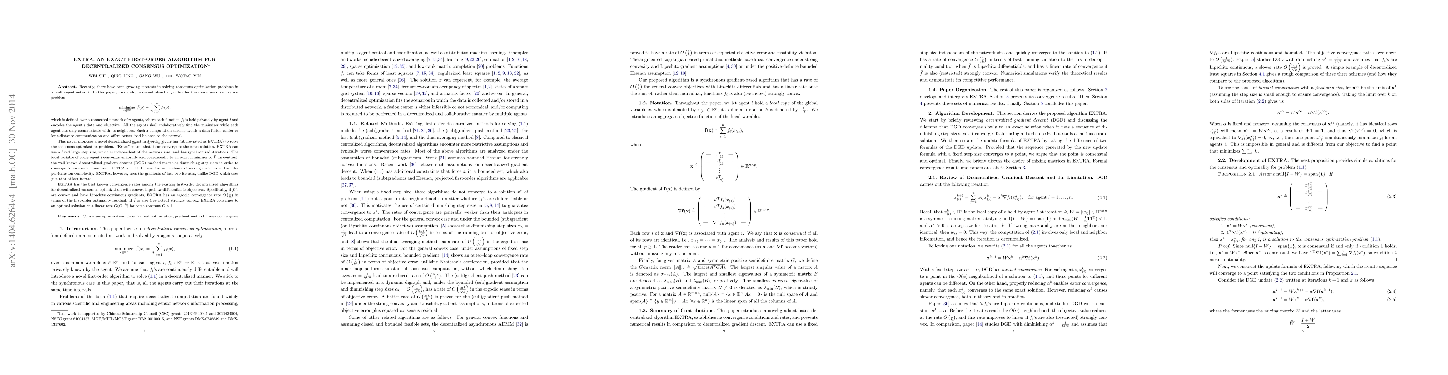 This paper proposes EXTRA, an exact first-order decentralized algorithm for solving consensus optimization problems in multi-agent networks. Unlike existing methods, EXTRA converges to the exact solution using a fixed step size and achieves optimal convergence rates, outperforming decentralized gradient descent.