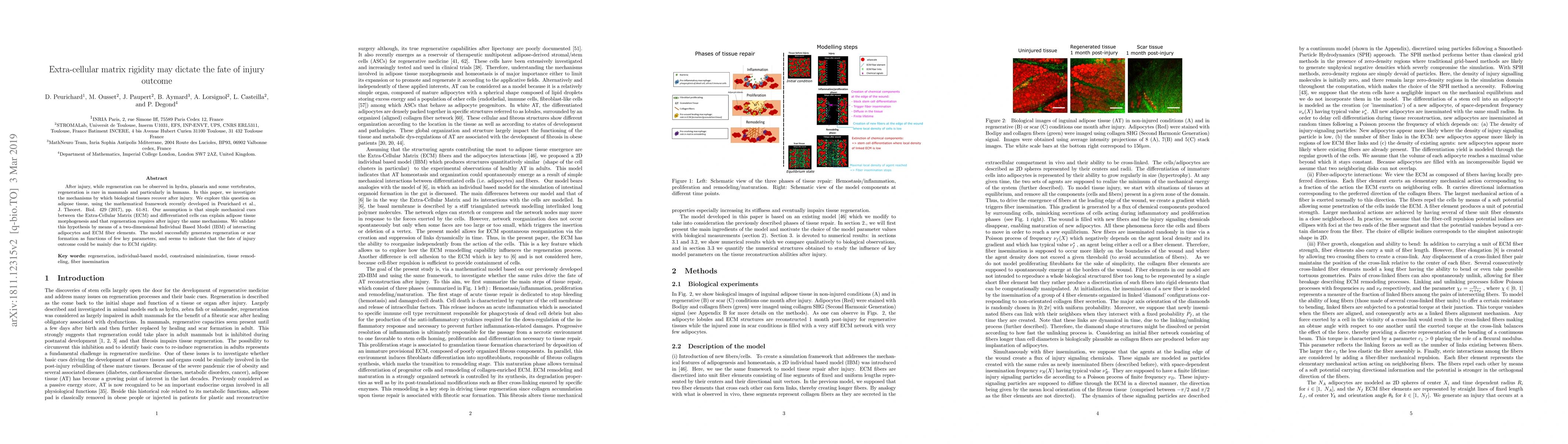 After injury, if regeneration can be observed in hydra, planaria and some vertebrates, regeneration is rare in mammals and particularly in humans. In this paper, we investigate the mechanisms by which biological tissues recover after injury. We explore this question on adipose tissue, using the mathematical framework recently developed in Peurichard et al, J. Theoret. Biol. 429 (2017), pp. 61-81. Our assumption is that simple mechanical cues between the Extra-Cellular Matrix (ECM) and differentiated cells can explain adipose tissue morphogenesis and that regeneration requires after injury the same mechanisms. We validate this hypothesis by means of a two-dimensional Individual Based Model (IBM) of interacting adipocytes and ECM fiber elements. The model successfully generates regeneration or scar formation as functions of few key parameters, and seems to indicate that the fate of injury outcome could be mainly due to ECM rigidity.