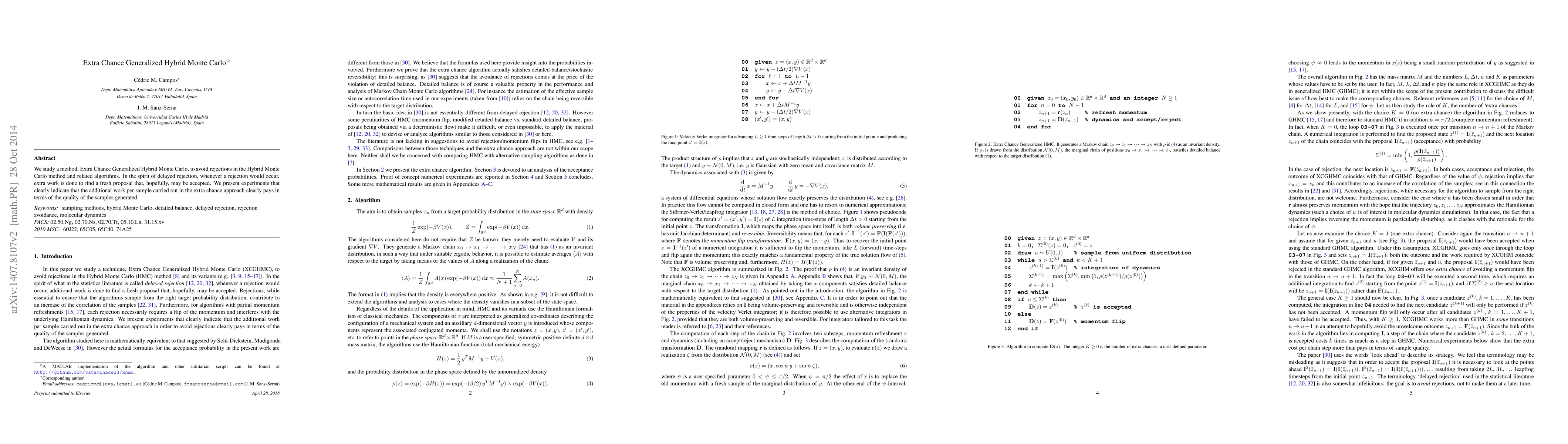 The Extra Chance Generalized Hybrid Monte Carlo method aims to reduce rejections in Hybrid Monte Carlo by generating new proposals when a rejection occurs, improving sample quality. Experiments show that the extra computational effort results in higher-quality samples.