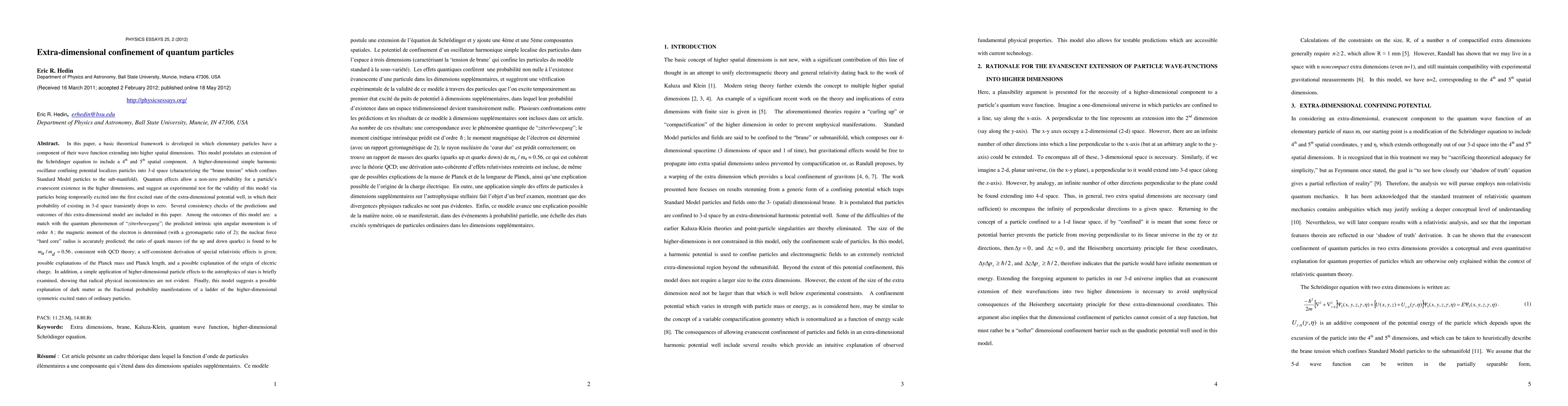 A basic theoretical framework is developed in which elementary particles have a component of their wave function extending into higher spatial dimensions. This model postulates an extension of the Schrodinger equation to include a 4th and 5th spatial component. A higher-dimensional simple harmonic oscillator confining potential localizes particles into 3-d space, characterizing the brane tension which confines Standard Model particles to the sub-manifold. Quantum effects allow a non-zero probability for a particle's evanescent existence in the higher dimensions, and suggest an experimental test for the validity of this model via particles being temporarily excited into the first excited state of the extra-dimensional potential well, in which their probability of existing in 3-d space transiently drops to zero. Several consistency checks of the outcomes of this extra-dimensional model are included in this paper. Among the outcomes of this model are: a match with the quantum phenomenon of zitterbewegung; the predicted intrinsic spin angular momentum is of order h/2Pi; the magnetic moment of the electron is determined with a gyromagnetic ratio of 2; the nuclear force hard core radius is accurately predicted; the ratio of the up and down quark masses is found to be mu/md=0.56, consistent with QCD theory; a self-consistent derivation of special relativistic effects is given; possible explanations of the Planck mass and Planck length, and a possible explanation of the origin of electric charge. In addition, a simple application of higher-dimensional particle effects to the astrophysics of stars is briefly examined, showing that radical physical inconsistencies are not evident. Finally, this model suggests a possible explanation of dark matter as the fractional probability manifestations of a ladder of the higher-dimensional symmetric excited states of ordinary particles.