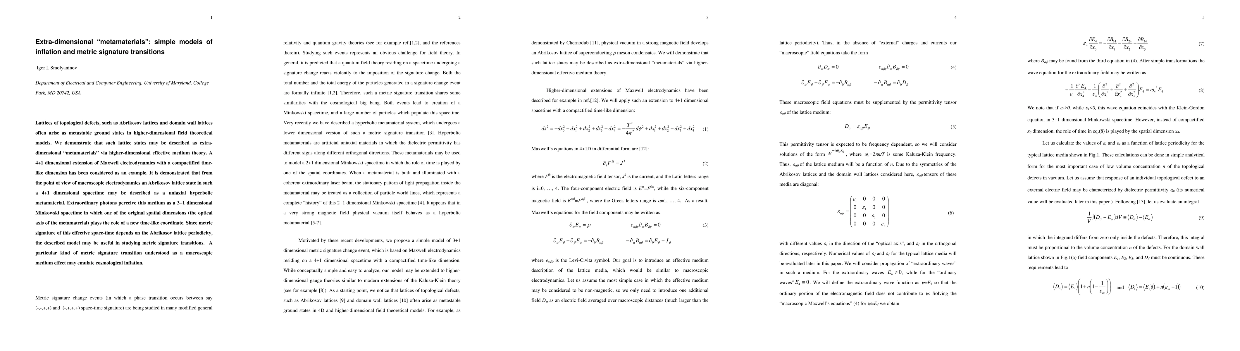 Lattices of topological defects, such as Abrikosov lattices and domain wall lattices often arise as metastable ground states in higher-dimensional field theoretical models. We demonstrate that such lattice states may be described as extra-dimensional metamaterials via higher-dimensional effective medium theory. A 4+1 dimensional extension of Maxwell electrodynamics with a compactified time-like dimension has been considered as an example. It is demonstrated that from the point of view of macroscopic electrodynamics an Abrikosov lattice state in such a 4+1 dimensional spacetime may be described as a uniaxial hyperbolic metamaterial. Extraordinary photons perceive this medium as a 3+1 dimensional Minkowski spacetime in which one of the original spatial dimensions (the optical axis of the metamaterial) plays the role of a new time-like coordinate. Since metric signature of this effective space-time depends on the Abrikosov lattice periodicity, the described model may be useful in studying metric signature transitions. A particular kind of metric signature transition understood as a macroscopic medium effect may emulate cosmological inflation.