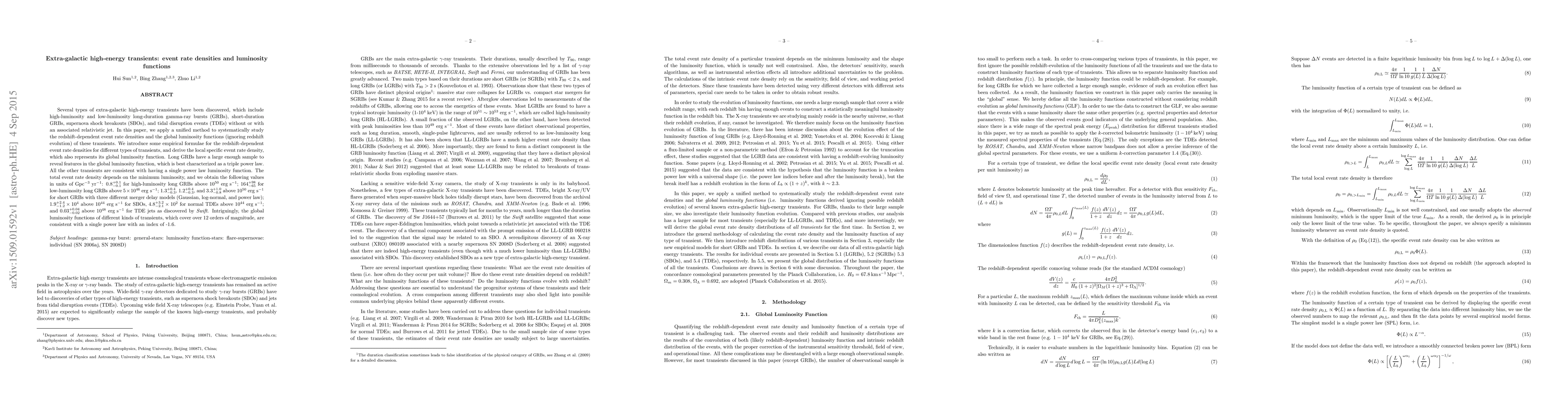 This study investigates extra-galactic high-energy transients, including GRBs and supernovae, using a unified method to determine their event rate densities and luminosity functions, revealing consistent global luminosity functions with a single power law index of -1.6 across various types of transients.