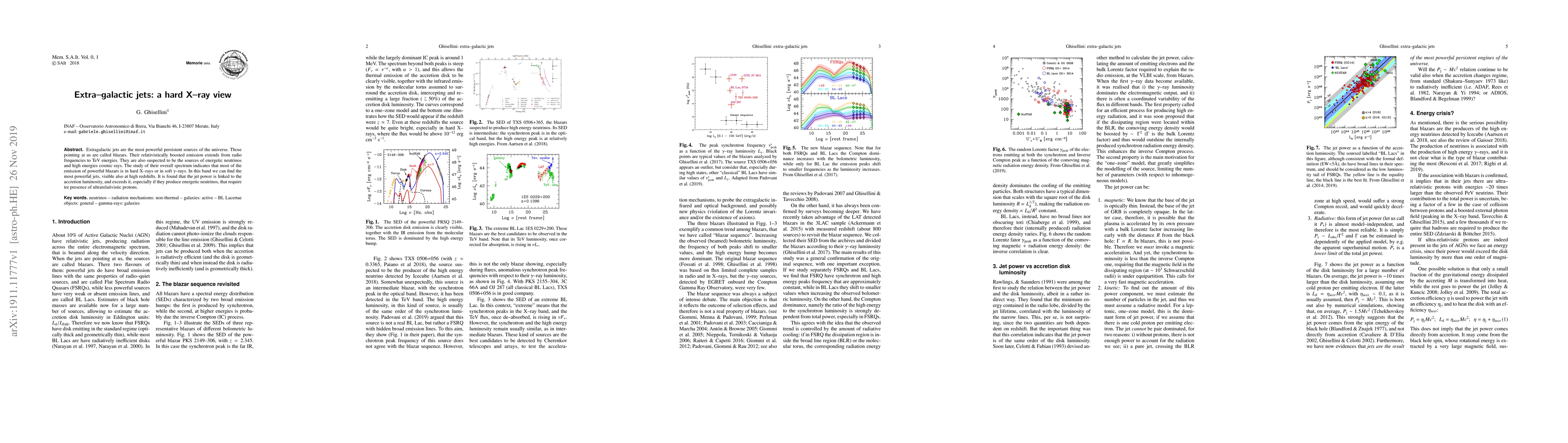 Extragalactic jets are the most powerful persistent sources of the universe. Those pointing at us are called blazars. Their relativistically boosted emission extends from radio frequencies to TeV energies. They are also suspected to be the sources of energetic neutrinos and high energies cosmic rays. The study of their overall spectrum indicates that most of the emission of powerful blazars is in hard X-rays or in soft gamma-rays. In this band we can find the most powerful jets, visible also at high redshifts. It is found that the jet power is linked to the accretion luminosity, and exceeds it, especially if they produce energetic neutrinos, that require the presence of ultrarelativistic protons.