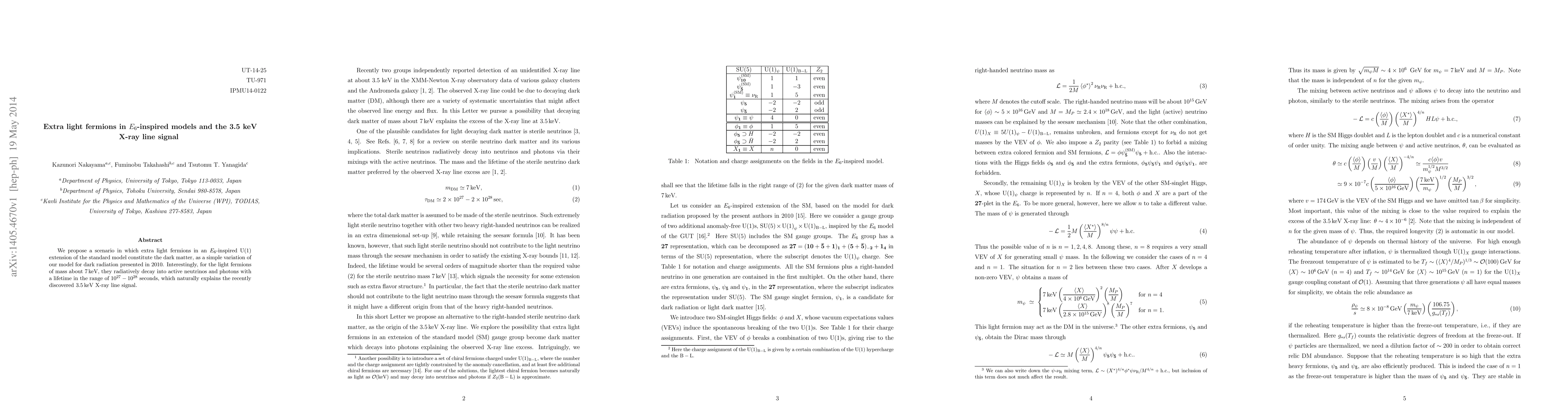 Extra light fermions in E6-inspired models could explain the 3.5 keV X-ray line signal through radiative decay into active neutrinos and photons.