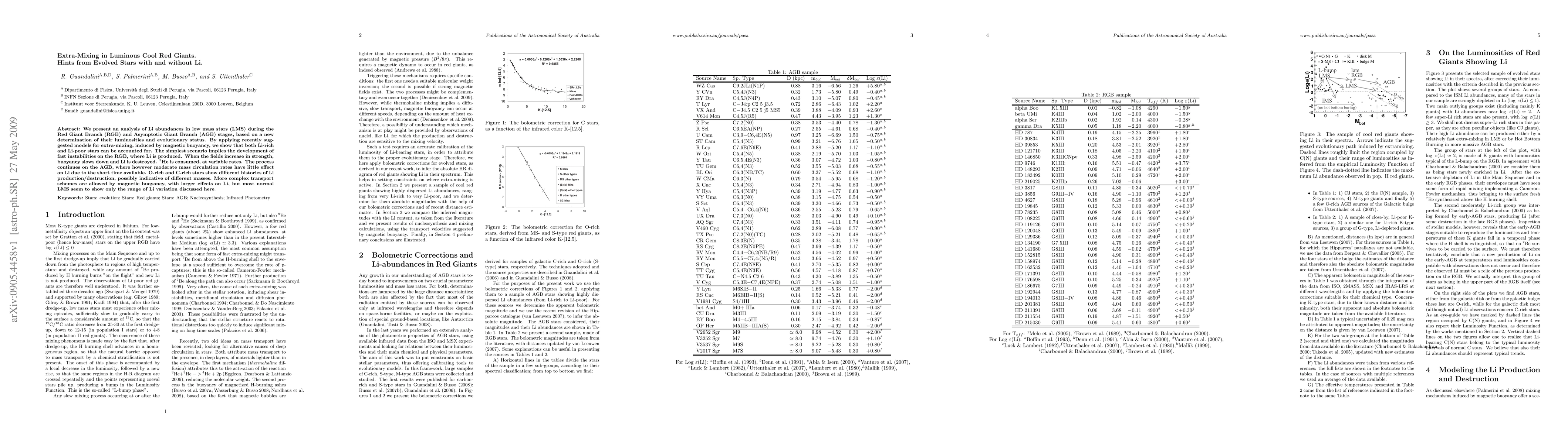 We present an analysis of Li abundances in low mass stars (LMS) during the Red Giant Branch (RGB) and Asymptotic Giant Branch (AGB) stages, based on a new determination of their luminosities and evolutionary status. By applying recently suggested models for extra-mixing, induced by magnetic buoyancy, we show that both Li-rich and Li-poor stars can be accounted for. The simplest scenario implies the development of fast instabilities on the RGB, where Li is produced. When the fields increase in strength, buoyancy slows down and Li is destroyed. 3He is consumed, at variable rates. The process continues on the AGB, where however moderate mass circulation rates have little effect on Li due to the short time available. O-rich and C-rich stars show different histories of Li production/destruction, possibly indicative of different masses. More complex transport schemes are allowed by magnetic buoyancy, with larger effects on Li, but most normal LMS seem to show only the range of Li variation discussed here.