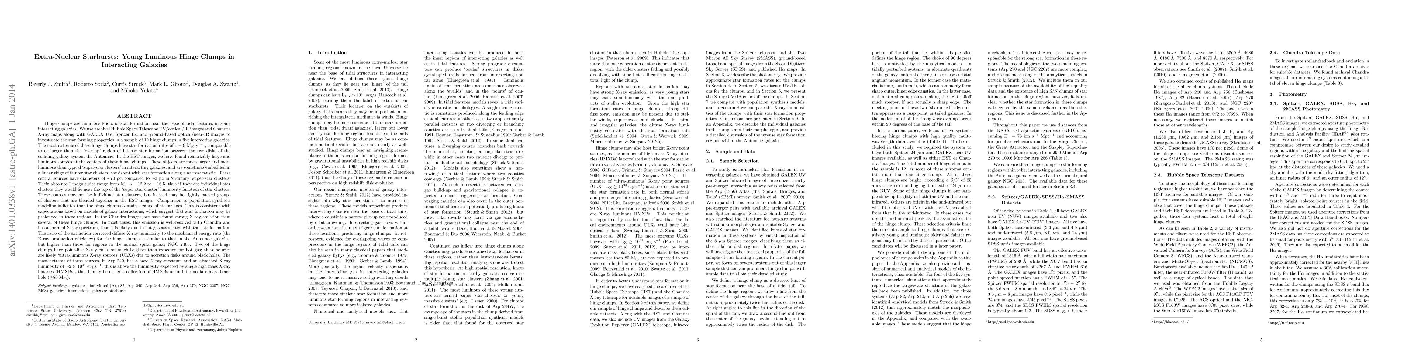 Hinge clumps are luminous knots of star formation near the base of tidal features in some interacting galaxies. We use archival Hubble Space Telescope UV/optical/IR images and Chandra X-ray maps along with GALEX UV, Spitzer IR, and ground-based optical/near-IR images to investigate the star forming properties in a sample of 12 hinge clumps in five interacting galaxies. The most extreme of these hinge clumps have star formation rates of 1 - 9 M(sun)/yr, comparable to or larger than the `overlap' region of intense star formation between the two disks of the colliding galaxy system the Antennae. In the HST images, we have found remarkably large (~70 pc) and luminous (M(I) ~ 12.2 to -16.5) sources at the centers of these hinge clumps, sometimes embedded in a linear ridge of fainter star clusters. We have found strong X-ray emission from several of these hinge clumps. In most cases, this emission is well-resolved with Chandra and has a thermal X-ray spectrum, thus it is likely due to hot gas associated with the star formation. The ratio of the extinction-corrected diffuse X-ray luminosity to the mechanical energy rate (the X-ray production efficiency) for the hinge clumps is similar to that in the Antennae galaxies, but higher than those for regions in the normal spiral galaxy NGC 2403. Two of the hinge clumps have point-like X-ray emission much brighter than expected for hot gas; these sources are likely `ultra-luminous X-ray sources' (ULXs) due to accretion disks around black holes. The most extreme of these sources, in Arp 240, has a hard X-ray spectrum and an absorbed X-ray luminosity of ~2 X 10^41 erg/s; more than expected by single high mass X-ray binaries (HMXBs), thus it may be either a collection of HMXBs or an intermediate-mass black hole (>=80 M(sun)). [ abridged ]