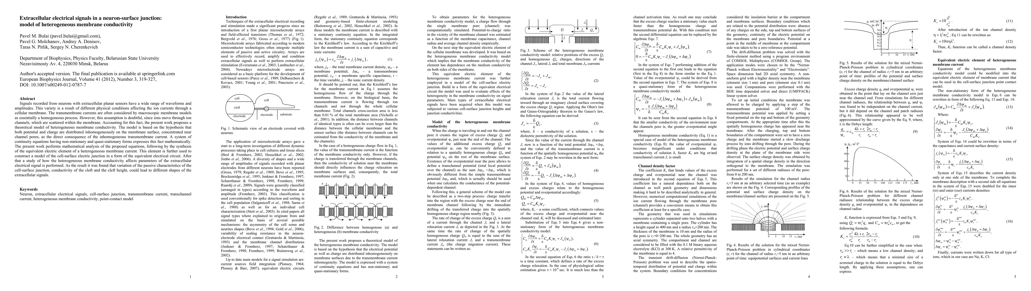 Signals recorded from neurons with extracellular planar sensors have a wide range of waveforms and amplitudes. This variety is a result of different physical conditions affecting the ion currents through a cellular membrane. The transmembrane currents are often considered by macroscopic membrane models as essentially a homogeneous process. However, this assumption is doubtful, since ions move through ion channels, which are scattered within the membrane. Accounting for this fact, the present work proposes a theoretical model of heterogeneous membrane conductivity. The model is based on the hypothesis that both potential and charge are distributed inhomogeneously on the membrane surface, concentrated near channel pores, as the direct consequence of the inhomogeneous transmembrane current. A system of continuity equations having non-stationary and quasi-stationary forms expresses this fact mathematically. The present work performs mathematical analysis of the proposed equations, following by the synthesis of the equivalent electric element of a heterogeneous membrane current. This element is further used to construct a model of the cell-surface electric junction in a form of the equivalent electrical circuit. After that a study of how the heterogeneous membrane conductivity affects parameters of the extracellular electrical signal is performed. As the result it was found that variation of the passive characteristics of the cell-surface junction, conductivity of the cleft and the cleft height, could lead to different shapes of the extracellular signals.