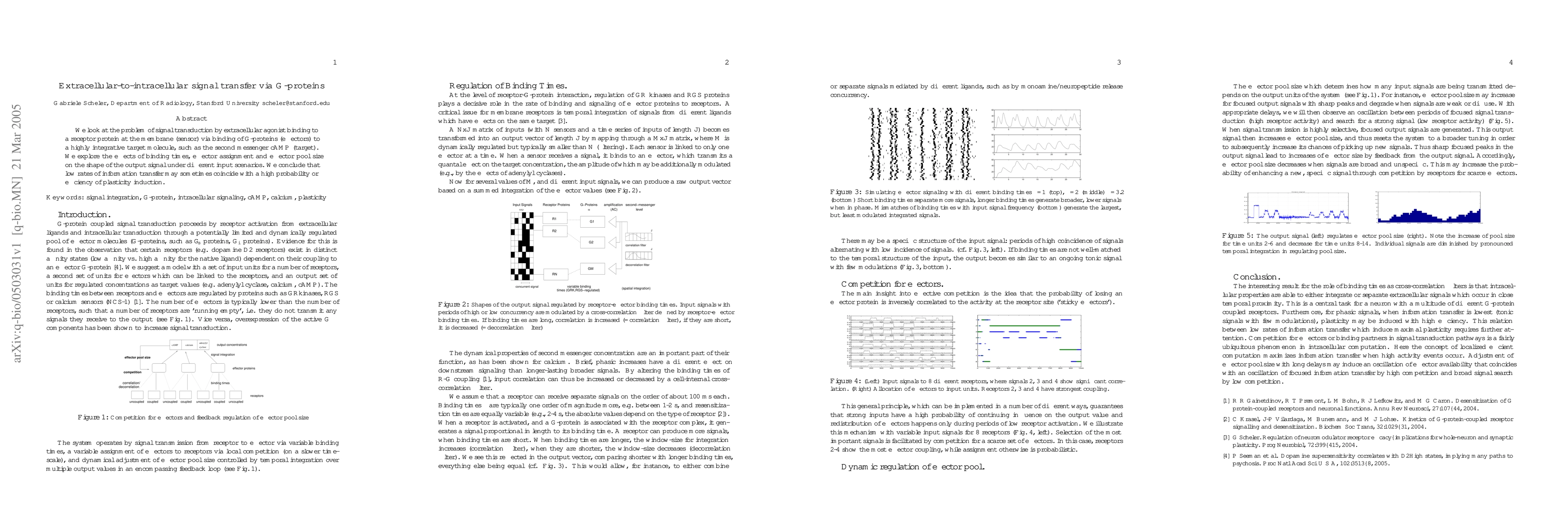 We look at the problem of signal transduction by extracellular agonist binding to a receptor protein at the membrane (sensor) via binding of G-proteins (effectors) to a highly integrative target molecule, such as the second messenger cAMP (target). We explore the effects of binding times, effector assignment and effector pool size on the shape of the output signal under different input scenarios. We conclude that low rates of information transfer may sometimes coincide with a high probability or efficiency of plasticity induction.