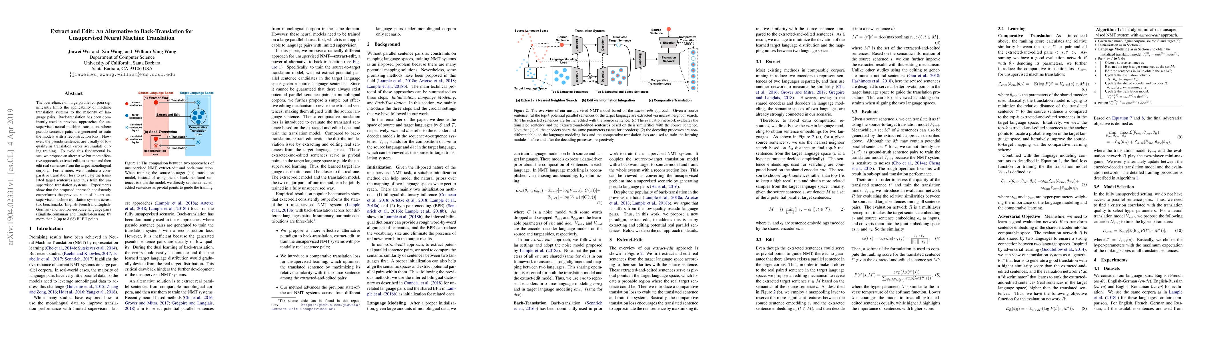 The overreliance on large parallel corpora significantly limits the applicability of machine translation systems to the majority of language pairs. Back-translation has been dominantly used in previous approaches for unsupervised neural machine translation, where pseudo sentence pairs are generated to train the models with a reconstruction loss. However, the pseudo sentences are usually of low quality as translation errors accumulate during training. To avoid this fundamental issue, we propose an alternative but more effective approach, extract-edit, to extract and then edit real sentences from the target monolingual corpora. Furthermore, we introduce a comparative translation loss to evaluate the translated target sentences and thus train the unsupervised translation systems. Experiments show that the proposed approach consistently outperforms the previous state-of-the-art unsupervised machine translation systems across two benchmarks (English-French and English-German) and two low-resource language pairs (English-Romanian and English-Russian) by more than 2 (up to 3.63) BLEU points.