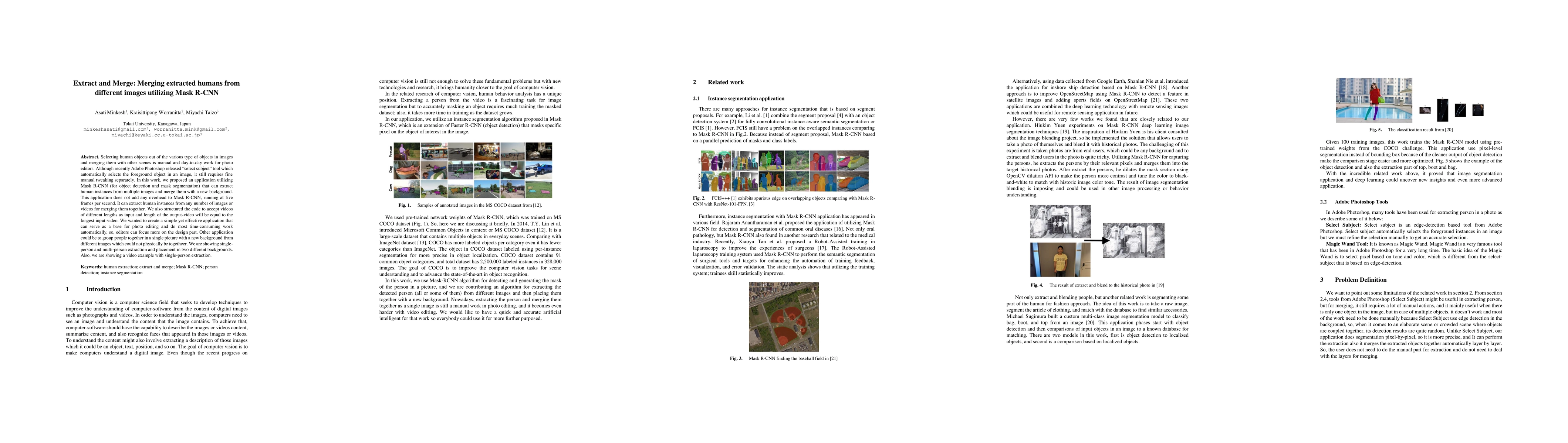 This paper proposes an application using Mask R-CNN to automatically extract human instances from multiple images and merge them with new backgrounds, aiming to automate time-consuming photo editing tasks. The application runs at 5 frames per second and can handle videos of varying lengths.