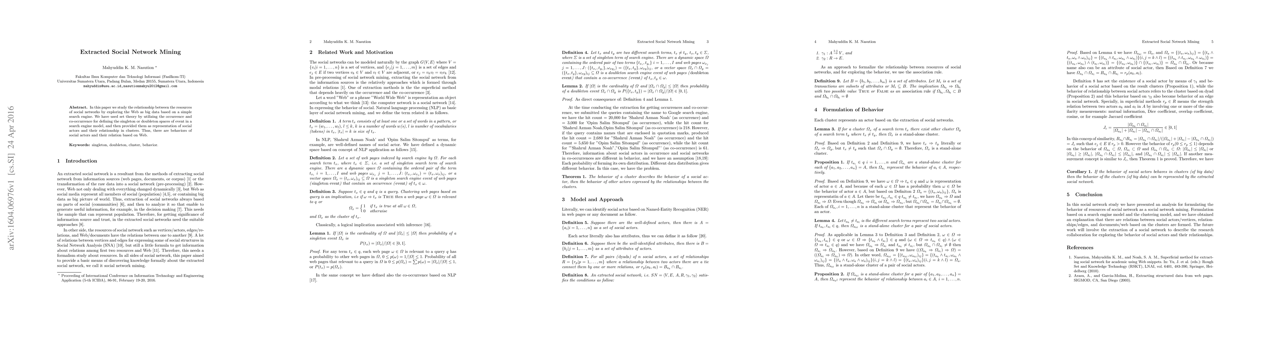In this paper we study the relationship between the resources of social networks by exploring the Web as big data based on a simple search engine. We have used set theory by utilizing the occurrence and co-occurrence for defining the singleton or doubleton spaces of event in a search engine model, and then provided them as representation of social actors and their relationship in clusters. Thus, there are behaviors of social actors and their relation based on Web.