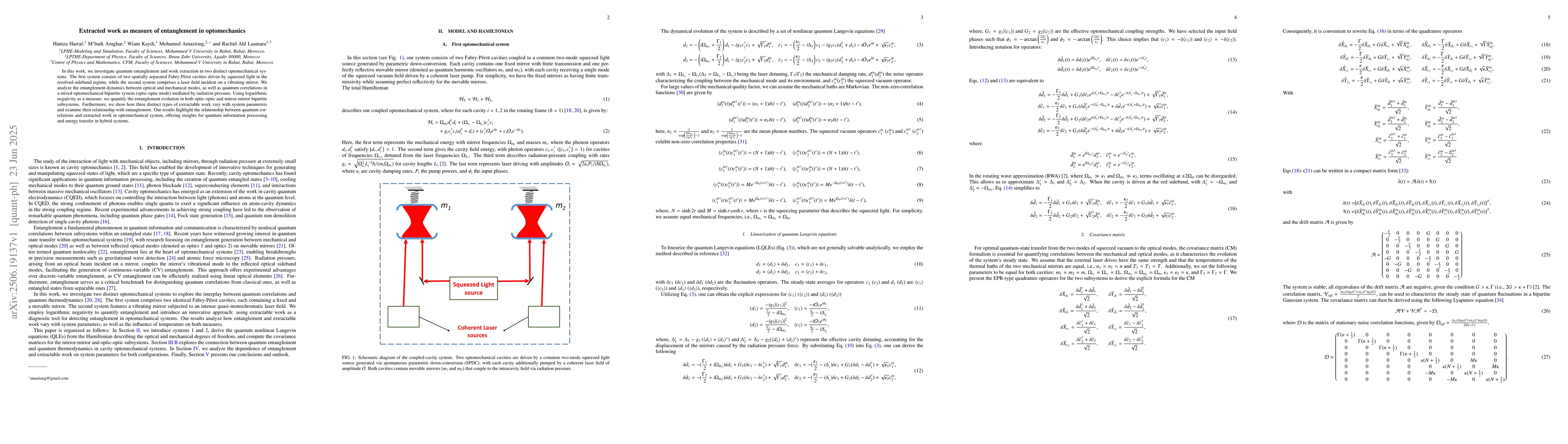 In this work, we investigate quantum entanglement and work extraction in two distinct optomechanical systems. The first system consists of two spatially separated Fabry-P\'erot cavities driven by squeezed light in the resolved-sideband regime, while the second system comprises a laser field incident on a vibrating mirror. We analyze the entanglement dynamics between optical and mechanical modes, as well as quantum correlations in a mixed optomechanical bipartite system (optic-optic mode) mediated by radiation pressure. Using logarithmic negativity as a measure, we quantify the entanglement evolution in both optic-optic and mirror-mirror bipartite subsystems. Furthermore, we show how three distinct types of extractable work vary with system parameters and examine their relationship with entanglement. Our results highlight the relationship between quantum correlations and extracted work in optomechanical system, offering insights for quantum information processing and energy transfer in hybrid systems.