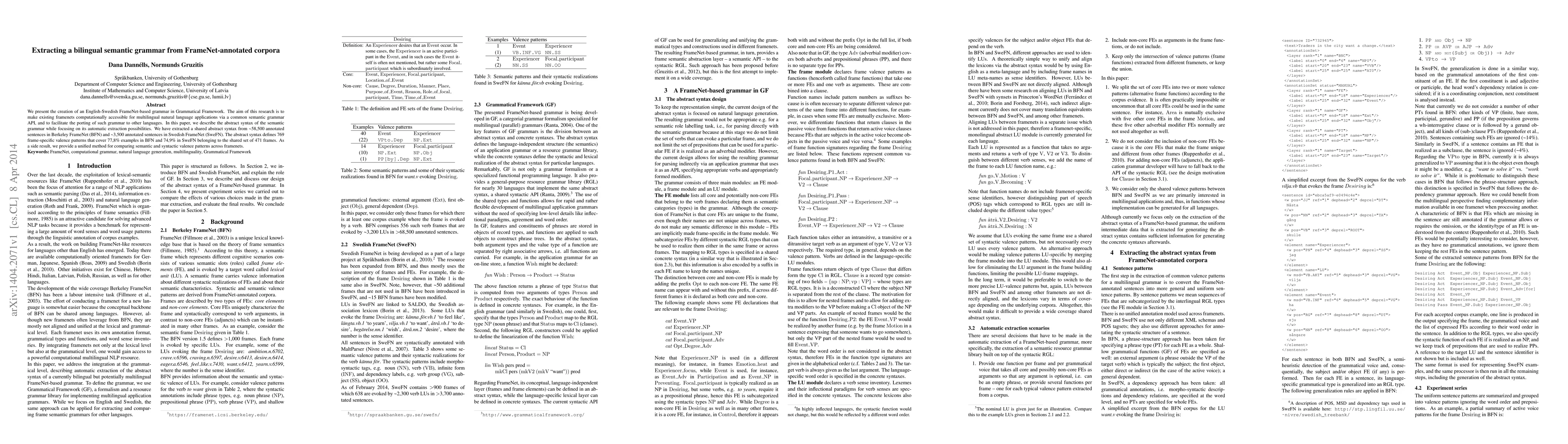 This paper details the creation of an English-Swedish bilingual semantic grammar based on FrameNet, extracted from annotated corpora, to enhance multilingual natural language applications. The research also presents an abstract syntax for the grammar and a method for comparing valence patterns across different framenets.