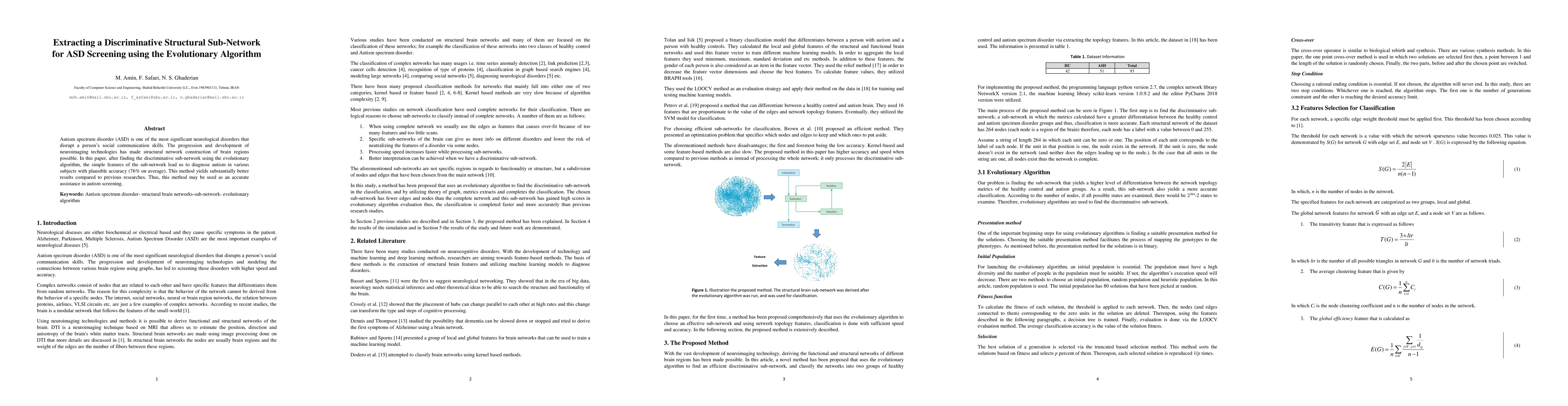 Autism spectrum disorder (ASD) is one of the most significant neurological disorders that disrupt a person's social communication skills. The progression and development of neuroimaging technologies has made structural network construction of brain regions possible. In this paper, after finding the discriminative sub-network using the evolutionary algorithm, the simple features of the sub-network lead us to diagnose autism in various subjects with plausible accuracy (76% on average). This method yields substantially better results compared to previous researches. Thus, this method may be used as an accurate assistance in autism screening