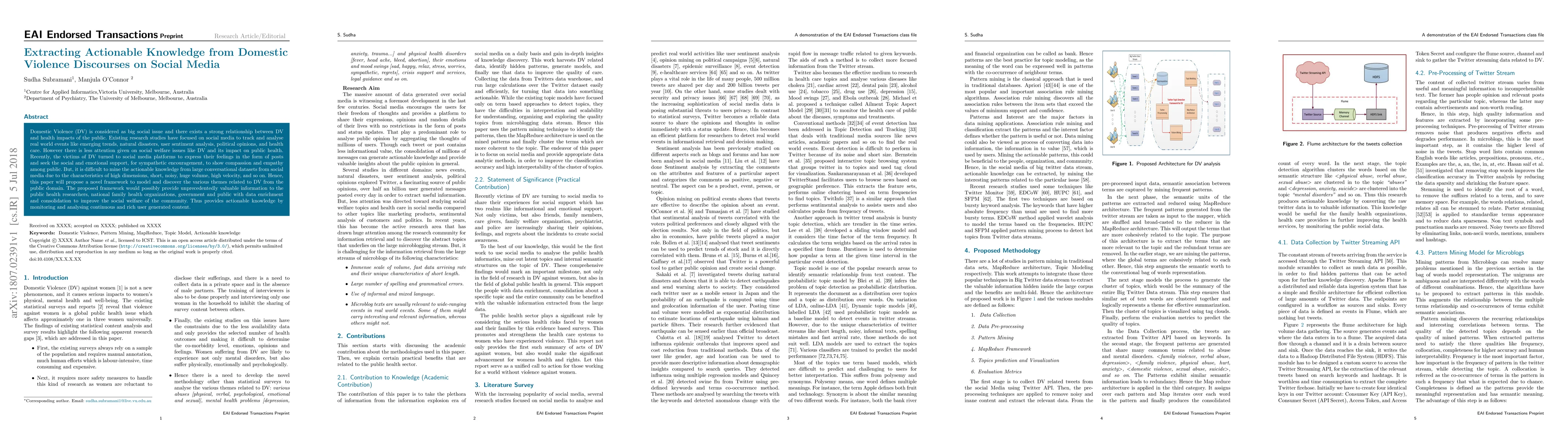 Domestic Violence (DV) is considered as big social issue and there exists a strong relationship between DV and health impacts of the public. Existing research studies have focused on social media to track and analyse real world events like emerging trends, natural disasters, user sentiment analysis, political opinions, and health care. However there is less attention given on social welfare issues like DV and its impact on public health. Recently, the victims of DV turned to social media platforms to express their feelings in the form of posts and seek the social and emotional support, for sympathetic encouragement, to show compassion and empathy among public. But, it is difficult to mine the actionable knowledge from large conversational datasets from social media due to the characteristics of high dimensions, short, noisy, huge volume, high velocity, and so on. Hence, this paper will propose a novel framework to model and discover the various themes related to DV from the public domain. The proposed framework would possibly provide unprecedentedly valuable information to the public health researchers, national family health organizations, government and public with data enrichment and consolidation to improve the social welfare of the community. Thus provides actionable knowledge by monitoring and analysing continuous and rich user generated content.