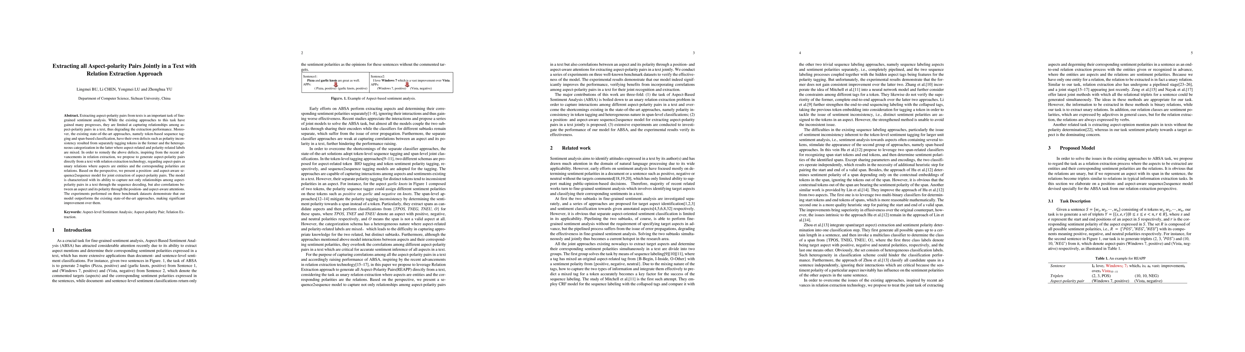 This paper proposes a joint extraction approach for aspect-polarity pairs using relation extraction techniques, addressing the limitations of existing token-based and span-based methods. The introduced position- and aspect-aware sequence2sequence model outperforms state-of-the-art methods on benchmark datasets by capturing relationships among aspect-polarity pairs and correlations between aspects and their polarities.