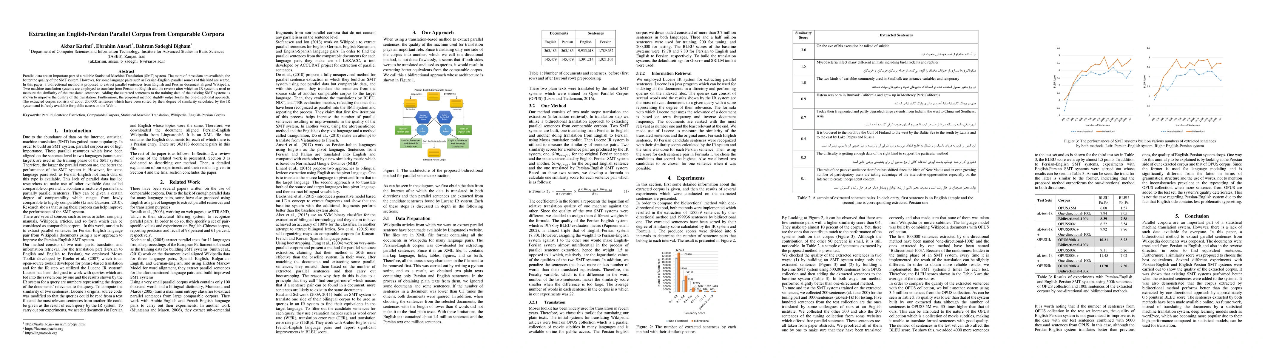 This paper proposes a bidirectional method to extract an English-Persian parallel corpus from aligned Wikipedia documents, using machine translation and an IR system to measure sentence similarity. The resulting corpus, consisting of about 200,000 sentences, improves the quality of Statistical Machine Translation systems and is publicly available online.