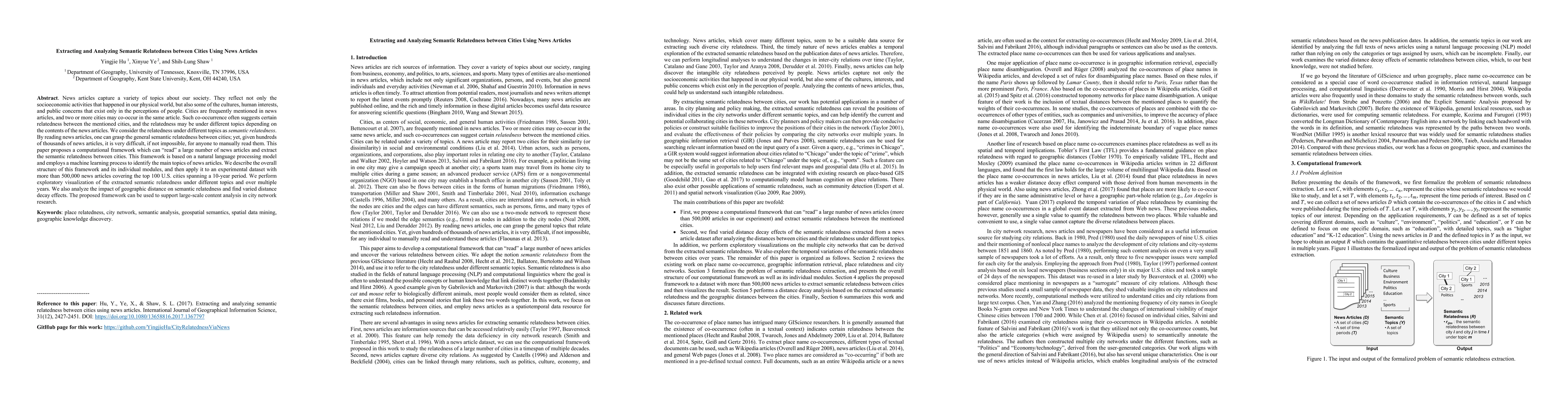 This paper proposes a computational framework to extract semantic relatedness between cities from news articles using natural language processing and machine learning. The framework analyzes over 500,000 news articles to identify topics and visualize relatedness, revealing varied distance decay effects and supporting large-scale city network research.