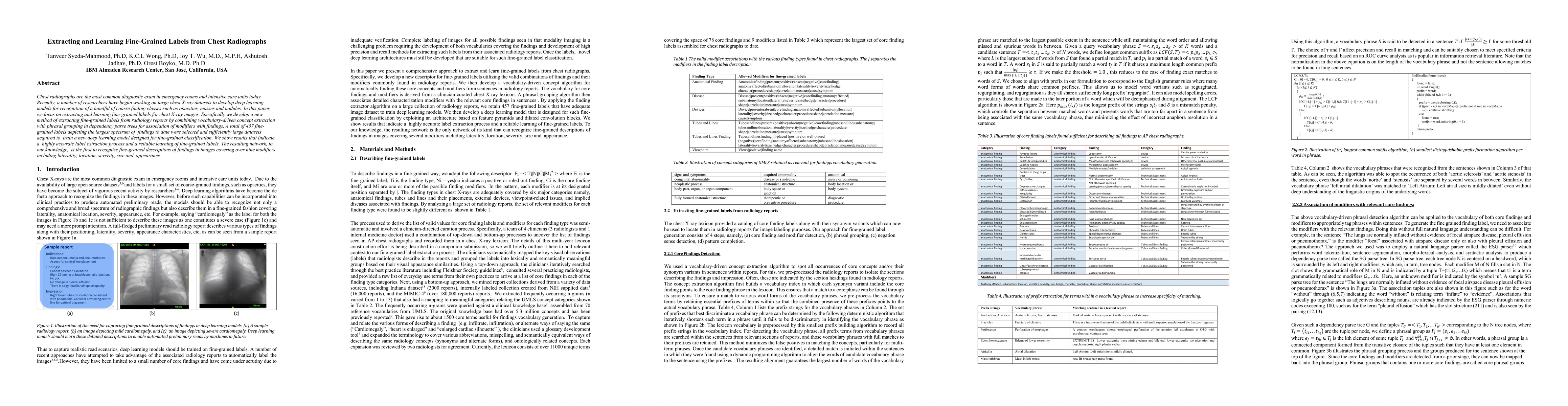 Chest radiographs are the most common diagnostic exam in emergency rooms and intensive care units today. Recently, a number of researchers have begun working on large chest X-ray datasets to develop deep learning models for recognition of a handful of coarse finding classes such as opacities, masses and nodules. In this paper, we focus on extracting and learning fine-grained labels for chest X-ray images. Specifically we develop a new method of extracting fine-grained labels from radiology reports by combining vocabulary-driven concept extraction with phrasal grouping in dependency parse trees for association of modifiers with findings. A total of 457 fine-grained labels depicting the largest spectrum of findings to date were selected and sufficiently large datasets acquired to train a new deep learning model designed for fine-grained classification. We show results that indicate a highly accurate label extraction process and a reliable learning of fine-grained labels. The resulting network, to our knowledge, is the first to recognize fine-grained descriptions of findings in images covering over nine modifiers including laterality, location, severity, size and appearance.