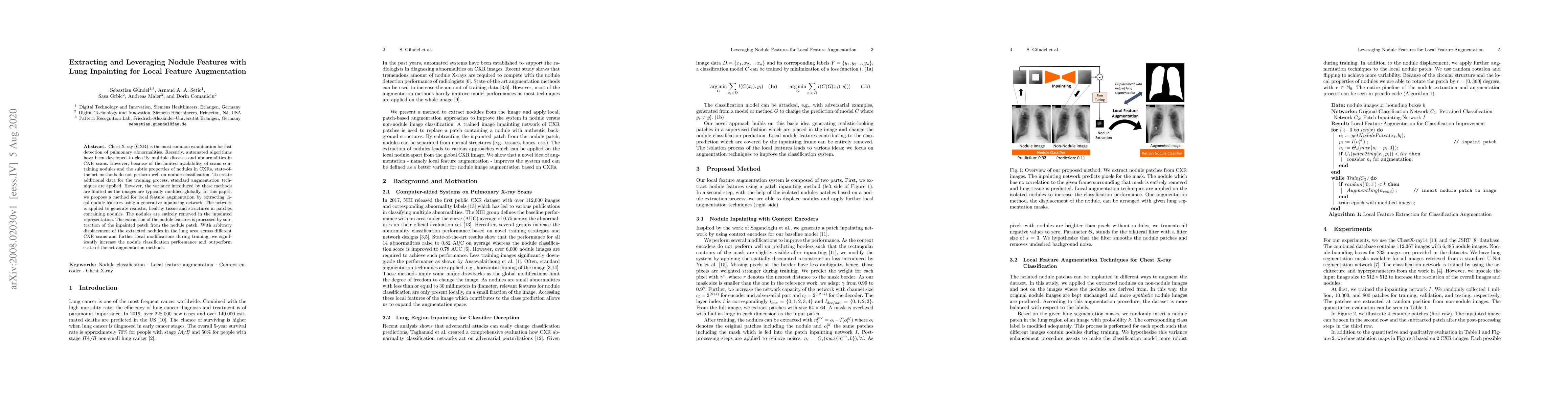 Chest X-ray (CXR) is the most common examination for fast detection of pulmonary abnormalities. Recently, automated algorithms have been developed to classify multiple diseases and abnormalities in CXR scans. However, because of the limited availability of scans containing nodules and the subtle properties of nodules in CXRs, state-of-the-art methods do not perform well on nodule classification. To create additional data for the training process, standard augmentation techniques are applied. However, the variance introduced by these methods are limited as the images are typically modified globally. In this paper, we propose a method for local feature augmentation by extracting local nodule features using a generative inpainting network. The network is applied to generate realistic, healthy tissue and structures in patches containing nodules. The nodules are entirely removed in the inpainted representation. The extraction of the nodule features is processed by subtraction of the inpainted patch from the nodule patch. With arbitrary displacement of the extracted nodules in the lung area across different CXR scans and further local modifications during training, we significantly increase the nodule classification performance and outperform state-of-the-art augmentation methods.