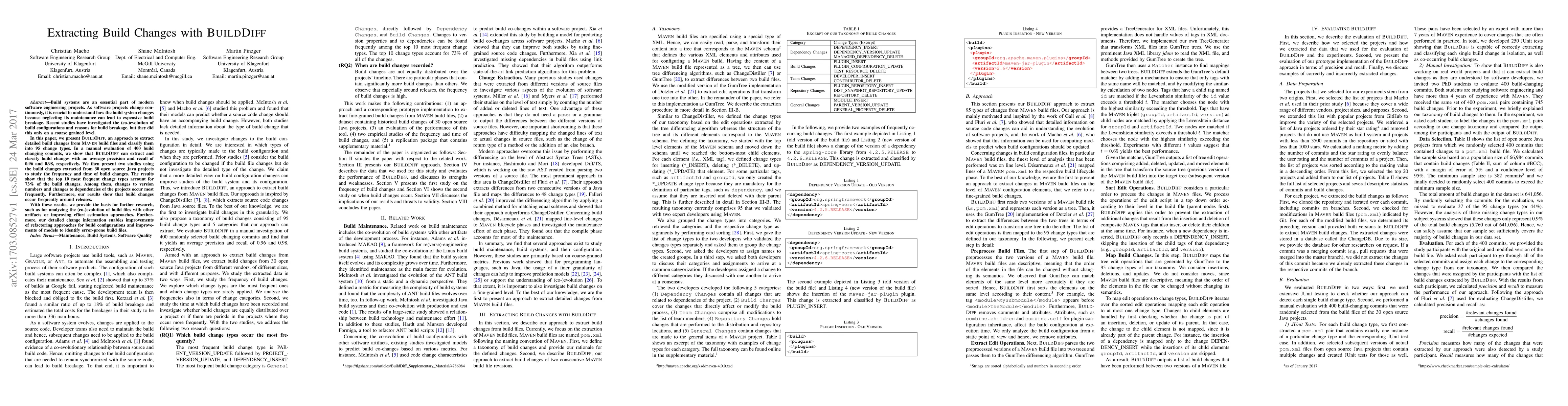 BUILDDIFF, an approach that extracts fine-grained build changes from Maven build files, classifying them into 95 types using a GumTree-based differencing algorithm.