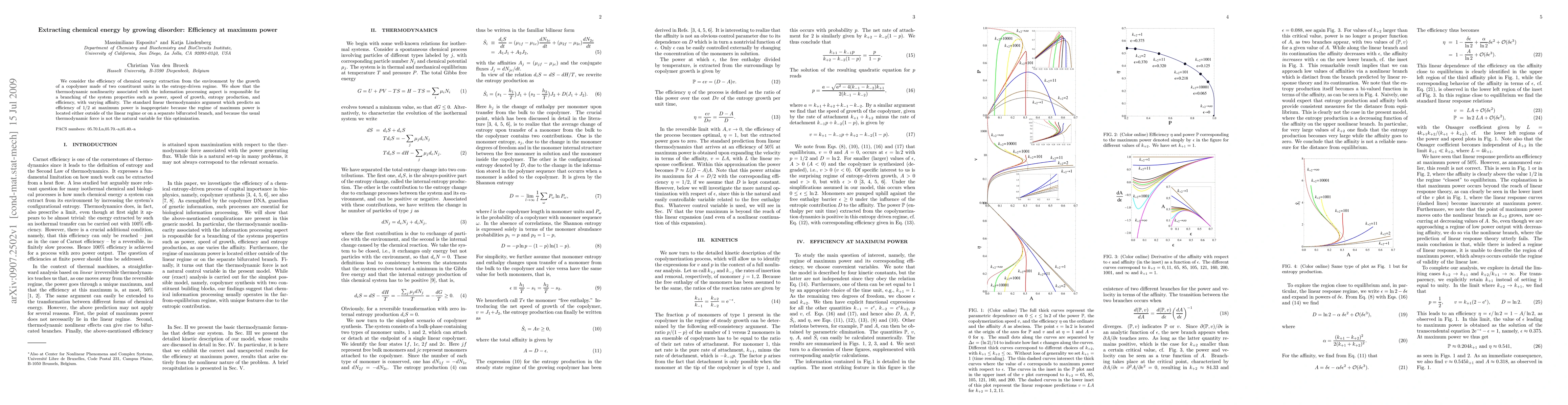 We consider the efficiency of chemical energy extraction from the environment by the growth of a copolymer made of two constituent units in the entropy-driven regime. We show that the thermodynamic nonlinearity associated with the information processing aspect is responsible for a branching of the system properties such as power, speed of growth, entropy production, and efficiency, with varying affinity. The standard linear thermodynamics argument which predicts an efficiency of 1/2 at maximum power is inappropriate because the regime of maximum power is located either outside of the linear regime or on a separate bifurcated branch, and because the usual thermodynamic force is not the natural variable for this optimization.