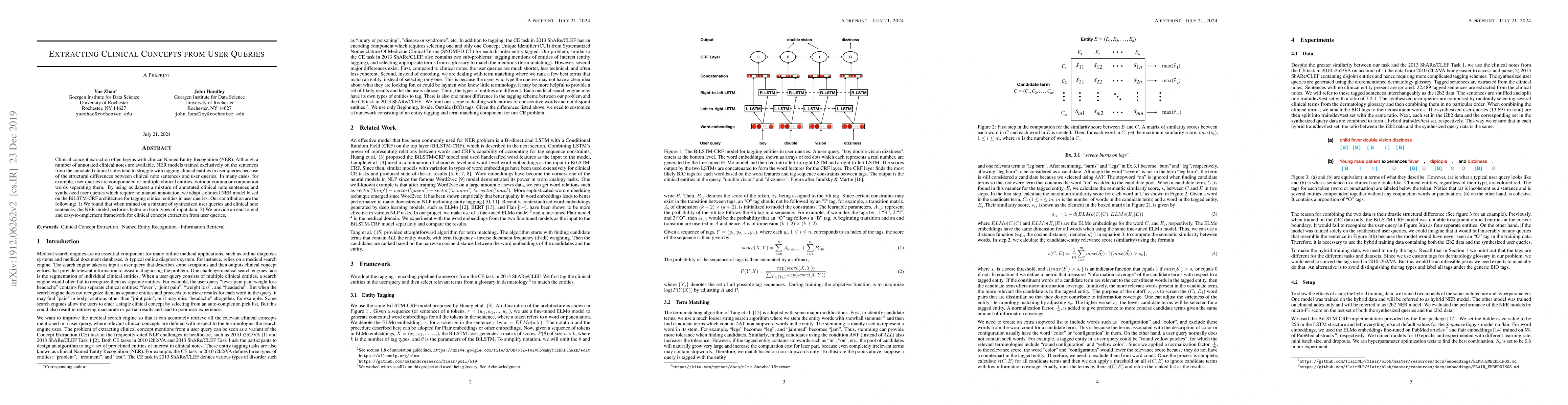 Clinical concept extraction often begins with clinical Named Entity Recognition (NER). Often trained on annotated clinical notes, clinical NER models tend to struggle with tagging clinical entities in user queries because of the structural differences between clinical notes and user queries. User queries, unlike clinical notes, are often ungrammatical and incoherent. In many cases, user queries are compounded of multiple clinical entities, without comma or conjunction words separating them. By using as dataset a mixture of annotated clinical notes and synthesized user queries, we adapt a clinical NER model based on the BiLSTM-CRF architecture for tagging clinical entities in user queries. Our contribution are the following: 1) We found that when trained on a mixture of synthesized user queries and clinical notes, the NER model performs better on both user queries and clinical notes. 2) We provide an end-to-end and easy-to-implement framework for clinical concept extraction from user queries.
