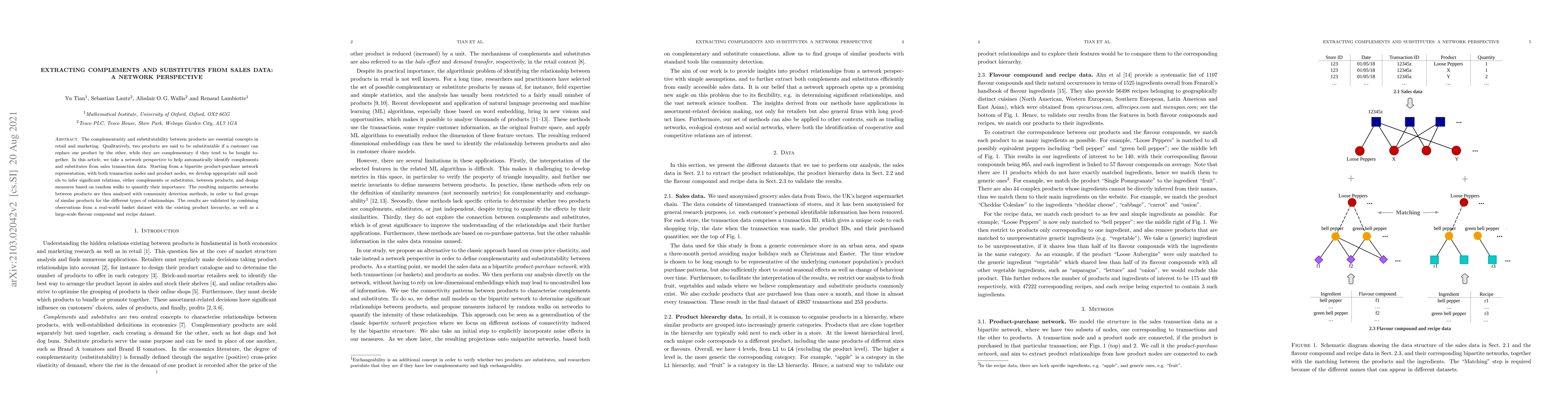 The complementarity and substitutability between products are essential concepts in retail and marketing. Qualitatively, two products are said to be substitutable if a customer can replace one product by the other, while they are complementary if they tend to be bought together. In this article, we take a network perspective to help automatically identify complements and substitutes from sales transaction data. Starting from a bipartite product-purchase network representation, with both transaction nodes and product nodes, we develop appropriate null models to infer significant relations, either complements or substitutes, between products, and design measures based on random walks to quantify their importance. The resulting unipartite networks between products are then analysed with community detection methods, in order to find groups of similar products for the different types of relationships. The results are validated by combining observations from a real-world basket dataset with the existing product hierarchy, as well as a large-scale flavour compound and recipe dataset.