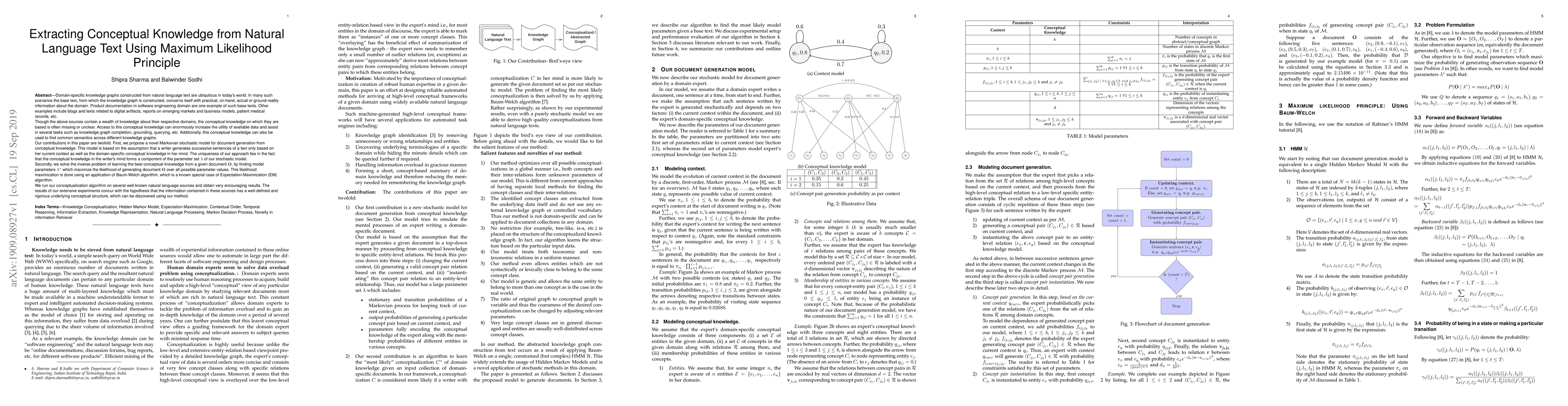 Domain-specific knowledge graphs constructed from natural language text are ubiquitous in today's world. In many such scenarios the base text, from which the knowledge graph is constructed, concerns itself with practical, on-hand, actual or ground-reality information about the domain. Product documentation in software engineering domain are one example of such base texts. Other examples include blogs and texts related to digital artifacts, reports on emerging markets and business models, patient medical records, etc. Though the above sources contain a wealth of knowledge about their respective domains, the conceptual knowledge on which they are based is often missing or unclear. Access to this conceptual knowledge can enormously increase the utility of available data and assist in several tasks such as knowledge graph completion, grounding, querying, etc. Our contributions in this paper are twofold. First, we propose a novel Markovian stochastic model for document generation from conceptual knowledge. The uniqueness of our approach lies in the fact that the conceptual knowledge in the writer's mind forms a component of the parameter set of our stochastic model. Secondly, we solve the inverse problem of learning the best conceptual knowledge from a given document, by finding model parameters which maximize the likelihood of generating the specific document over all possible parameter values. This likelihood maximization is done using an application of Baum-Welch algorithm, which is a known special case of Expectation-Maximization (EM) algorithm. We run our conceptualization algorithm on several well-known natural language sources and obtain very encouraging results. The results of our extensive experiments concur with the hypothesis that the information contained in these sources has a well-defined and rigorous underlying conceptual structure, which can be discovered using our method.