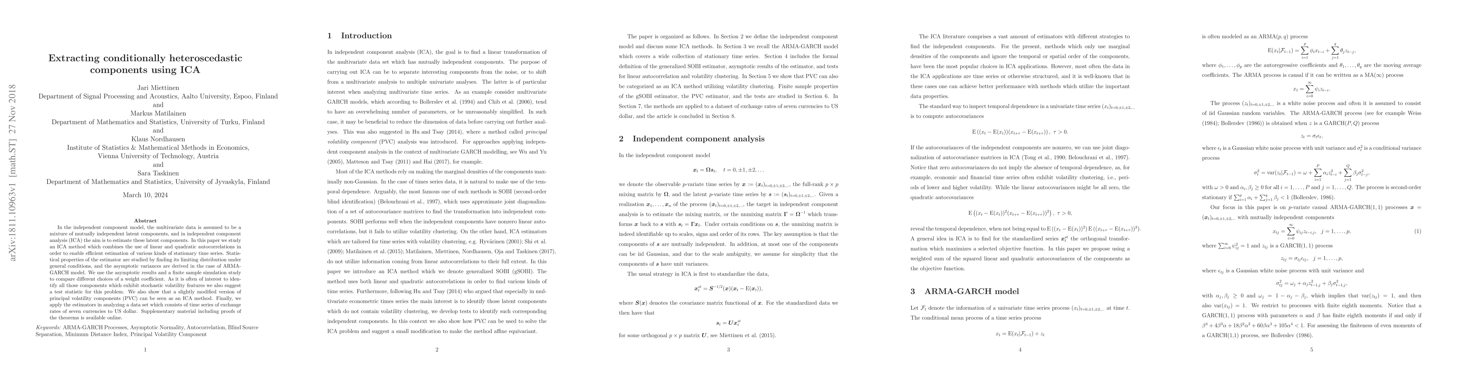 In the independent component model, the multivariate data is assumed to be a mixture of mutually independent latent components, and in independent component analysis (ICA) the aim is to estimate these latent components. In this paper we study an ICA method which combines the use of linear and quadratic autocorrelations in order to enable efficient estimation of various kinds of stationary time series. Statistical properties of the estimator are studied by finding its limiting distribution under general conditions, and the asymptotic variances are derived in the case of ARMA-GARCH model. We use the asymptotic results and a finite sample simulation study to compare different choices of a weight coefficient. As it is often of interest to identify all those components which exhibit stochastic volatility features we also suggest a test statistic for this problem. We also show that a slightly modified version of principal volatility components (PVC) can be seen as an ICA method. Finally, we apply the estimators in analyzing a data set which consists of time series of exchange rates of seven currencies to US dollar. Supplementary material including proofs of the theorems is available online.