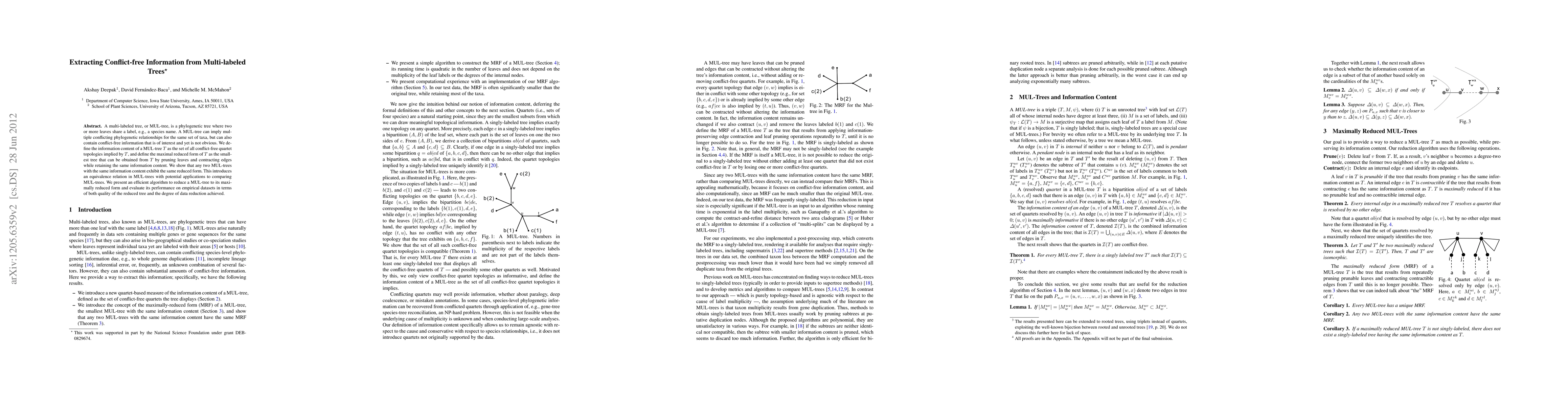 A multi-labeled tree, or MUL-tree, is a phylogenetic tree where two or more leaves share a label, e.g., a species name. A MUL-tree can imply multiple conflicting phylogenetic relationships for the same set of taxa, but can also contain conflict-free information that is of interest and yet is not obvious. We define the information content of a MUL-tree T as the set of all conflict-free quartet topologies implied by T, and define the maximal reduced form of T as the smallest tree that can be obtained from T by pruning leaves and contracting edges while retaining the same information content. We show that any two MUL-trees with the same information content exhibit the same reduced form. This introduces an equivalence relation in MUL-trees with potential applications to comparing MUL-trees. We present an efficient algorithm to reduce a MUL-tree to its maximally reduced form and evaluate its performance on empirical datasets in terms of both quality of the reduced tree and the degree of data reduction achieved.