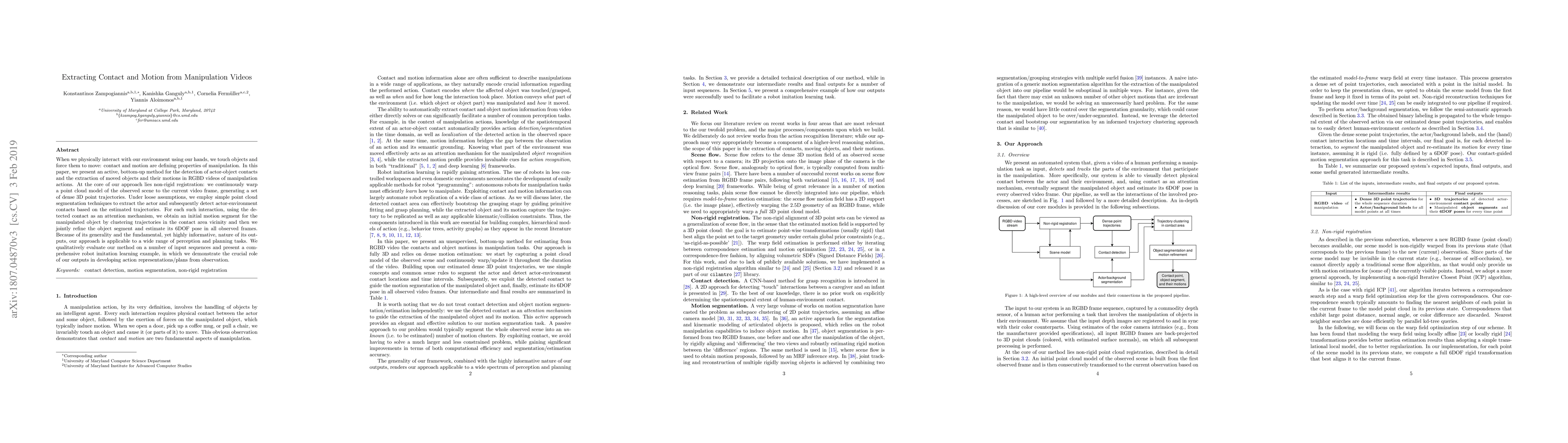 This paper proposes a method to detect actor-object contacts and extract moved objects and their motions from RGBD manipulation videos using non-rigid registration and point cloud segmentation. The approach identifies interactions and refines object segments to estimate 6DOF poses, demonstrating its utility in robot imitation learning.