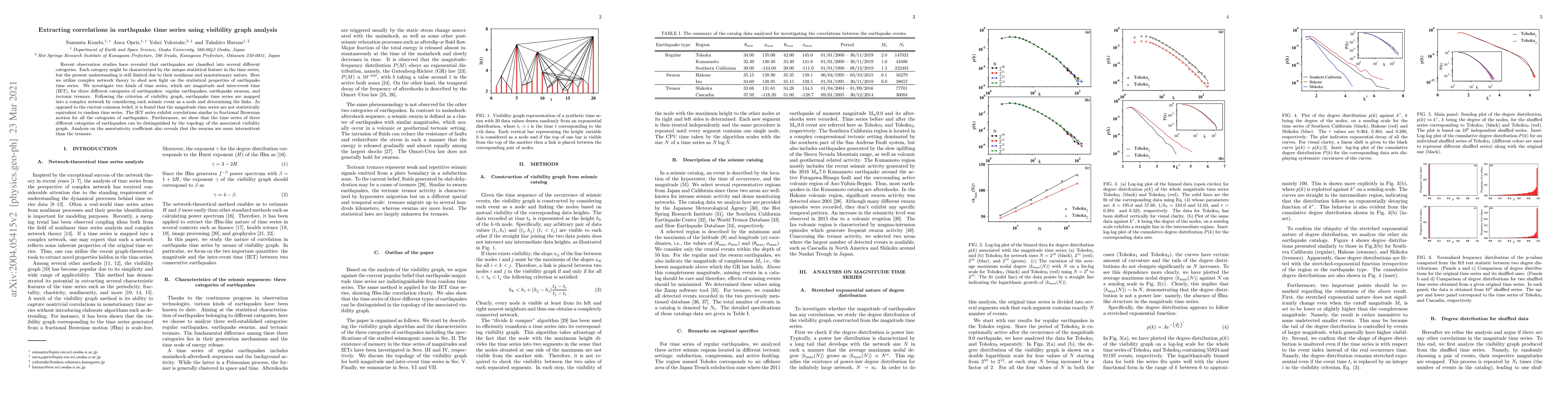 This paper employs visibility graph analysis to explore correlations in earthquake time series, revealing that magnitude series differ from random series and inter-event time series exhibit fractional Brownian motion-like correlations. The study distinguishes different earthquake categories based on the topology of their associated visibility graphs.